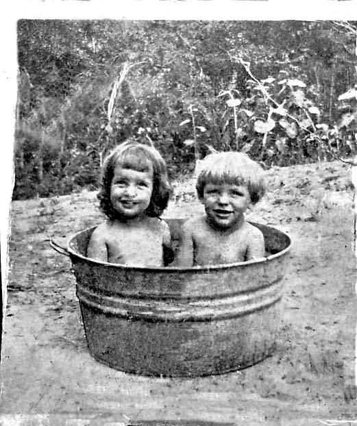 Lillie Margaret Hopkins (McHann) with her twin brother Arthur Harrison Hopkins, in a wash tub. ca 1920