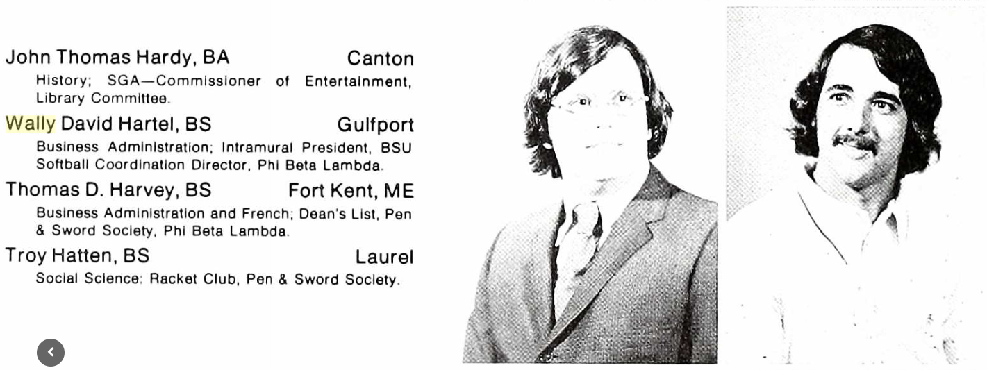 Walley David Hartel, William Carey College yearbook, Hattisburg, MS. 1974.