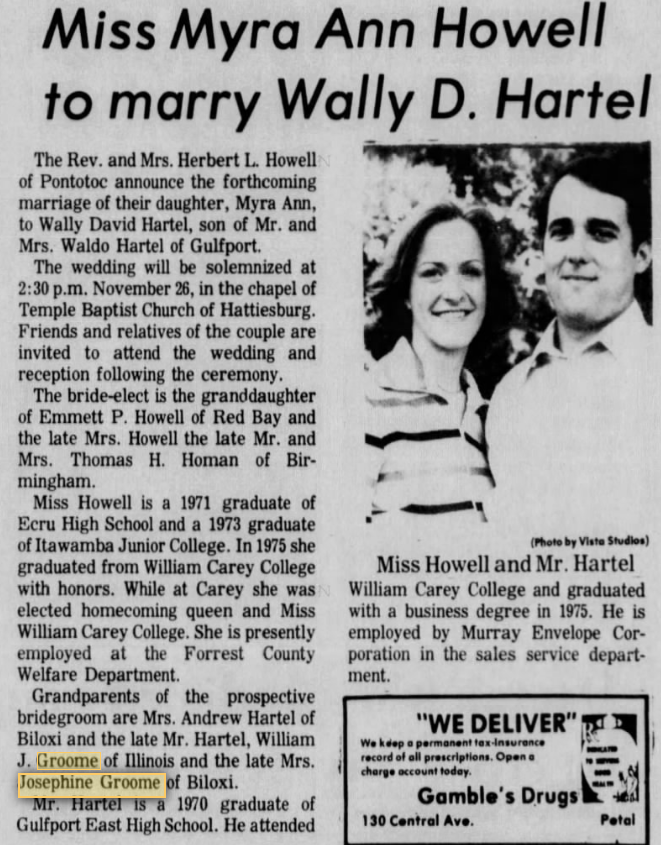 Walley David Hartel and Myra Ann Howell wedding announcement, , Hattisburg American, November 6, 1977.