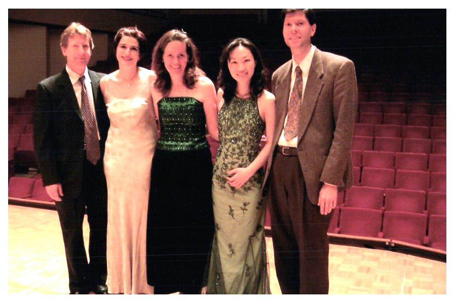 2007 Feb-Aug33 Maia Quartet with composer Piere Jalbert. Zoran, Hannah, Beth and Tricia. Post premiere of new quartet.