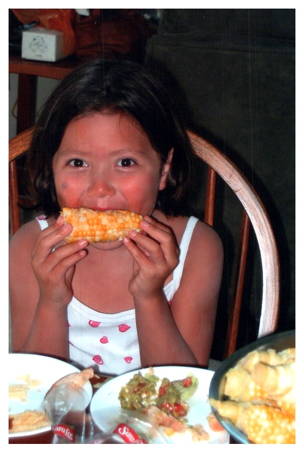 2007 Feb-Aug93 Emily Buck having corn on the cob, Giant Ridge reunion, Biwabik, MN