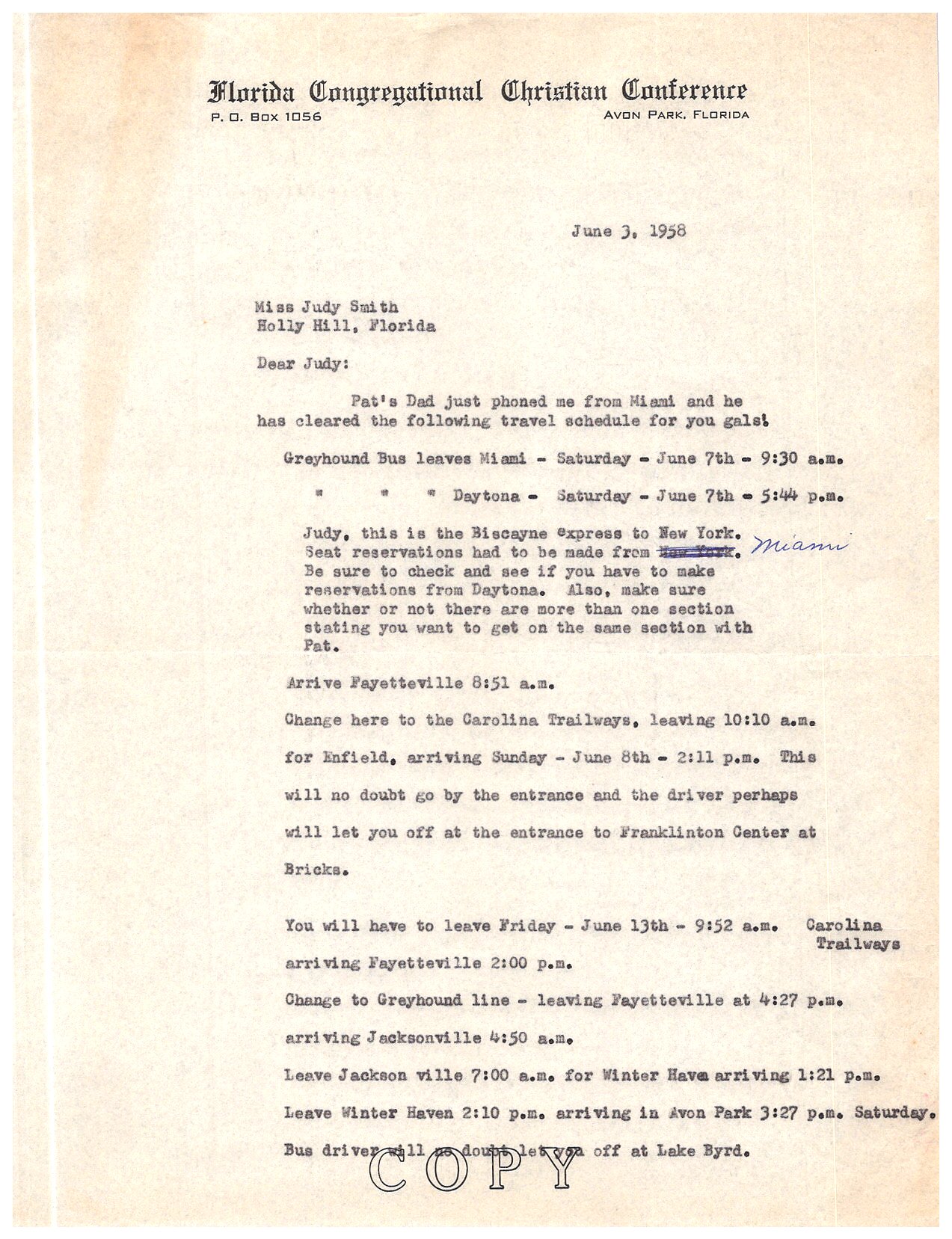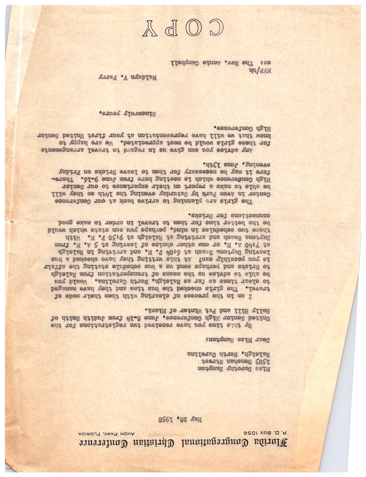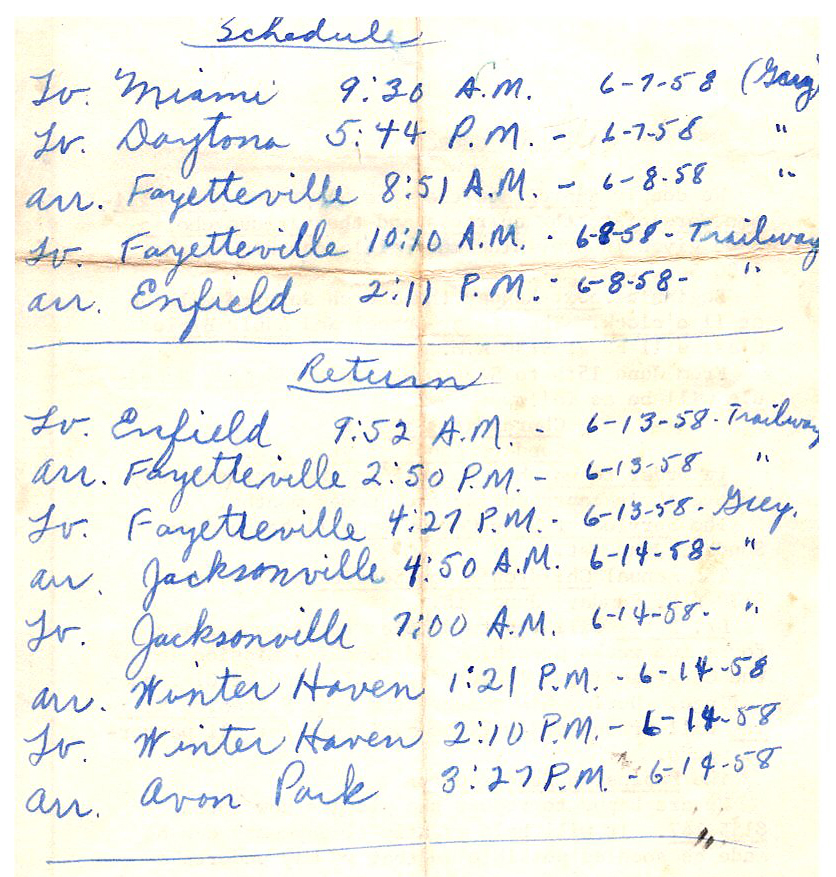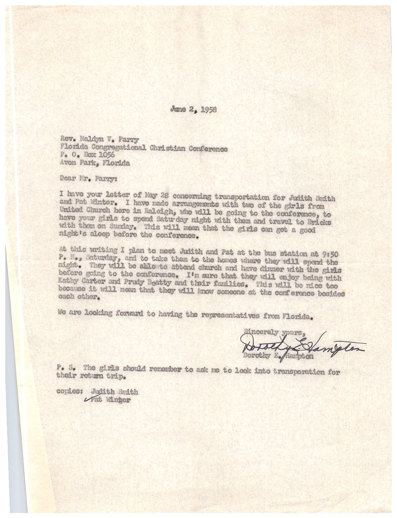 Since Dorothy Hampton's bus travel arrangements ended in Raleigh, she arranged for Pat and Judy to stay overnight in Raleigh with a family that was bringing their daughter to Bricks, however, characteristic of Pat's dad, Robert Winter, he worked his magic and arranged elaborate bus reservations that would take them all the way to Bricks, hence they declined Miss Hampton's offer. Pat and Judy were to return a day early in order to make a report on their trip to the Senior High Conference in Avon Park.