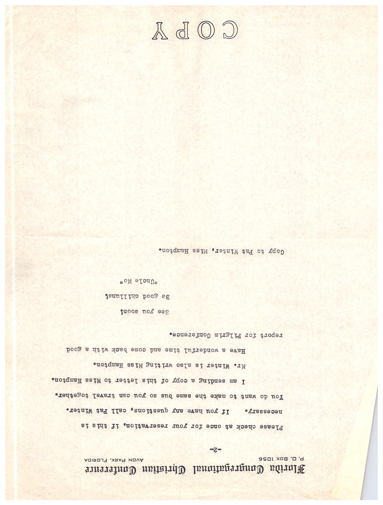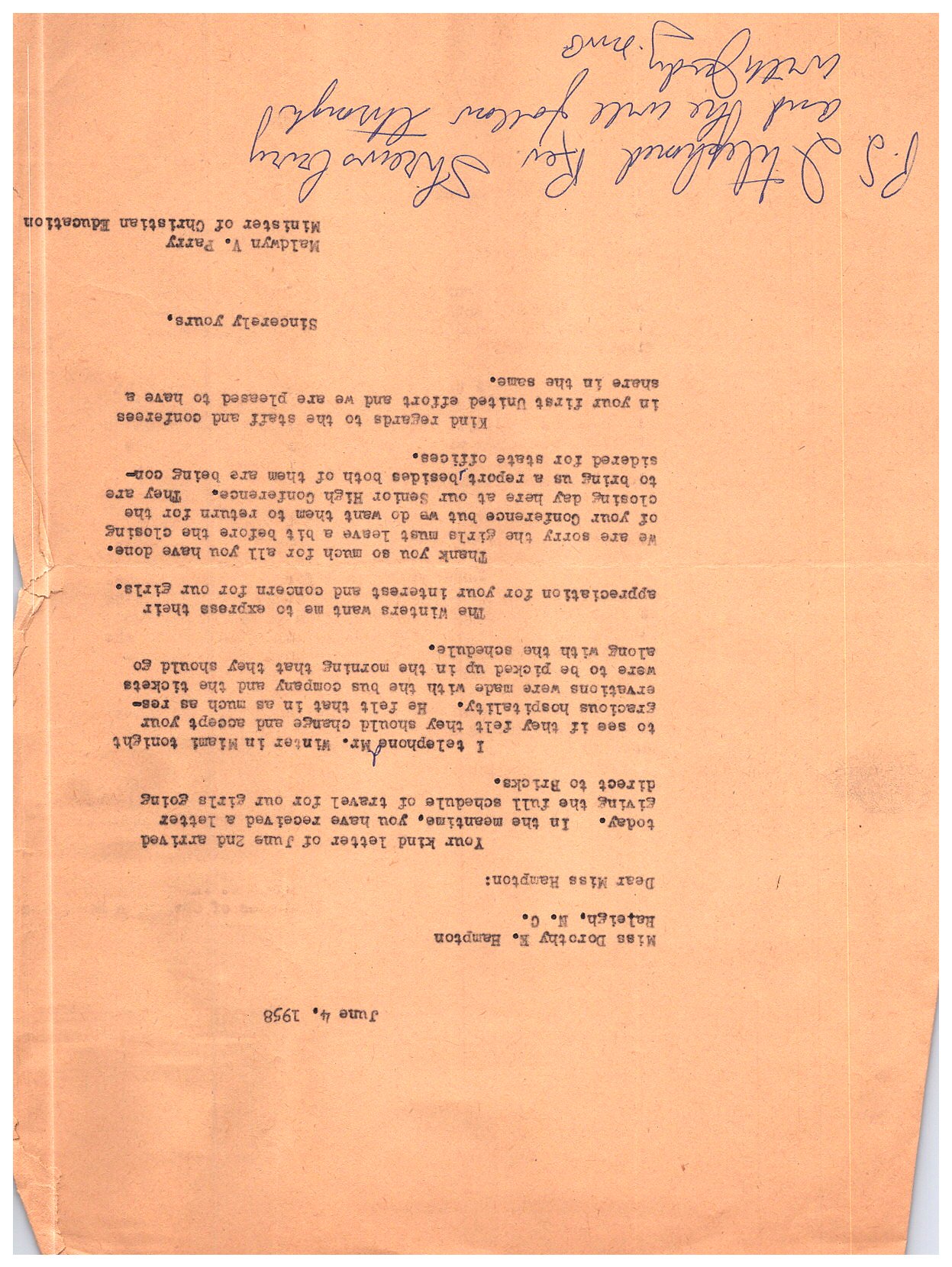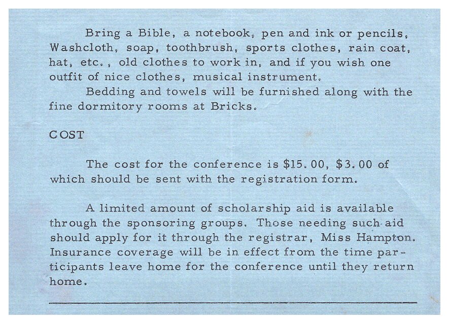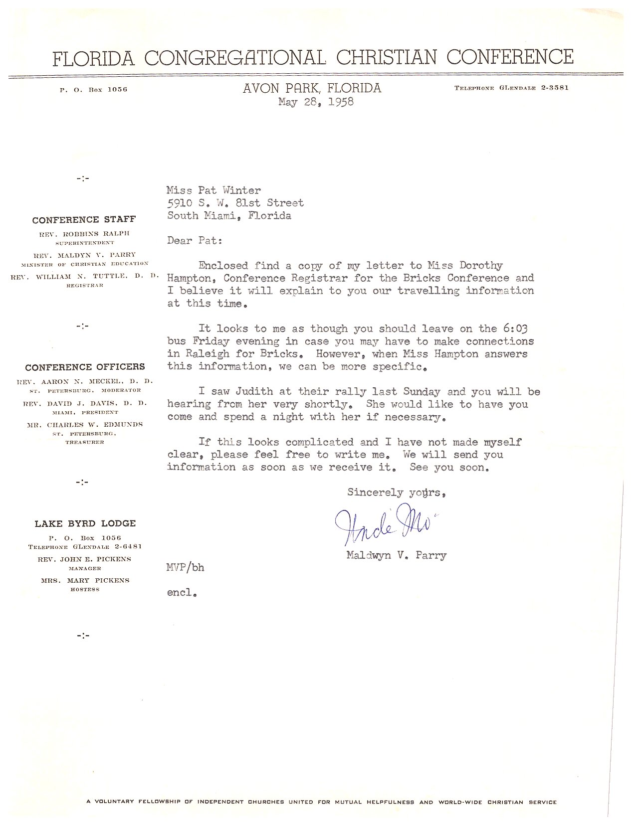 Since Dorothy Hampton's bus travel arrangements ended in Raleigh, she arranged for Pat and Judy to stay overnight in Raleigh with a family that was bringing their daughter to Bricks, however, characteristic of Pat's dad, Robert Winter, he worked his magic and arranged elaborate bus reservations that would take them all the way to Bricks, hence they declined Miss Hampton's offer. Pat and Judy were to return a day early in order to make a report on their trip to the Senior High Conference in Avon Park.