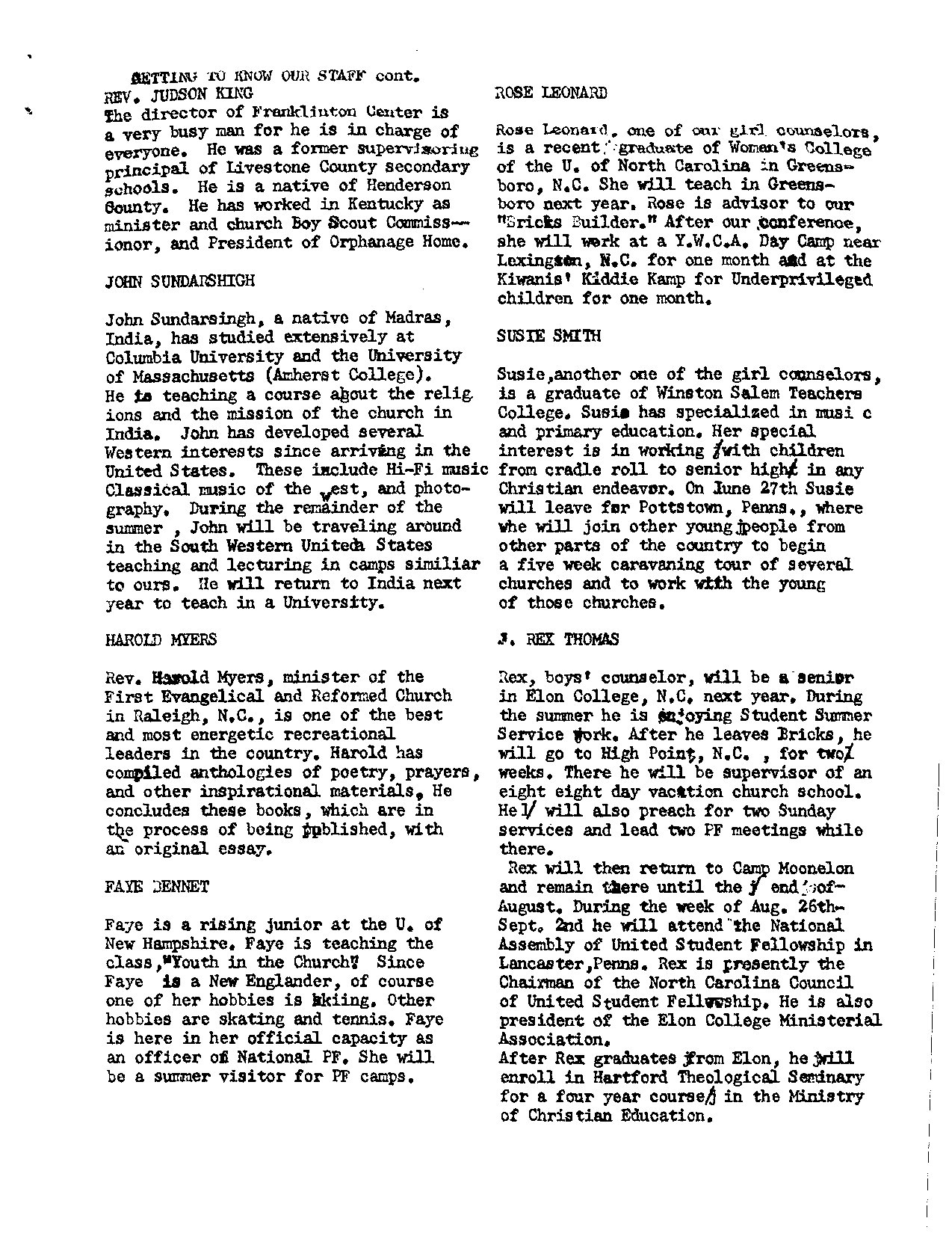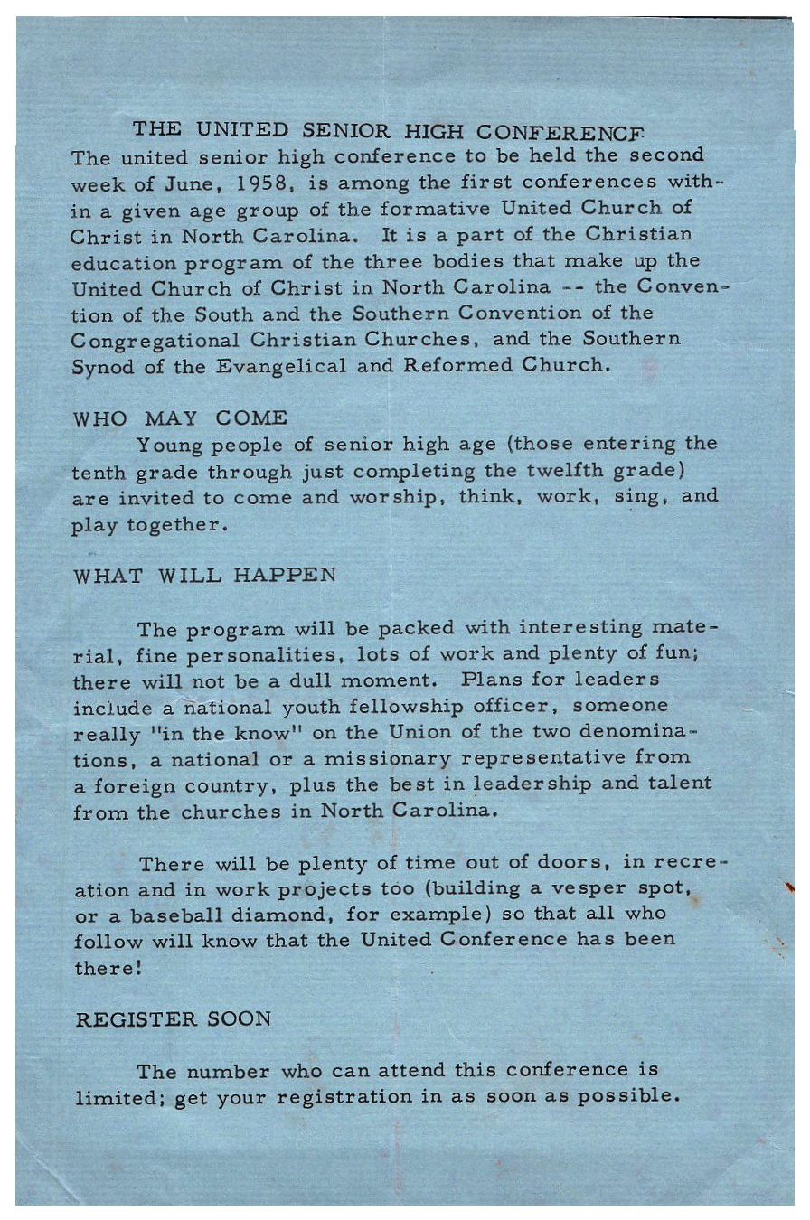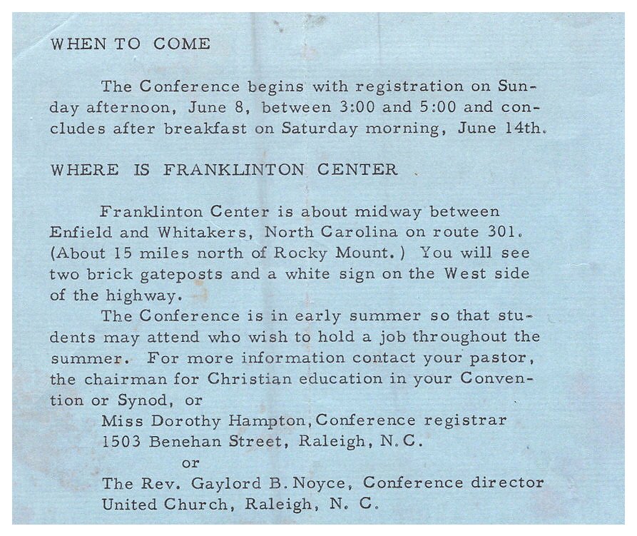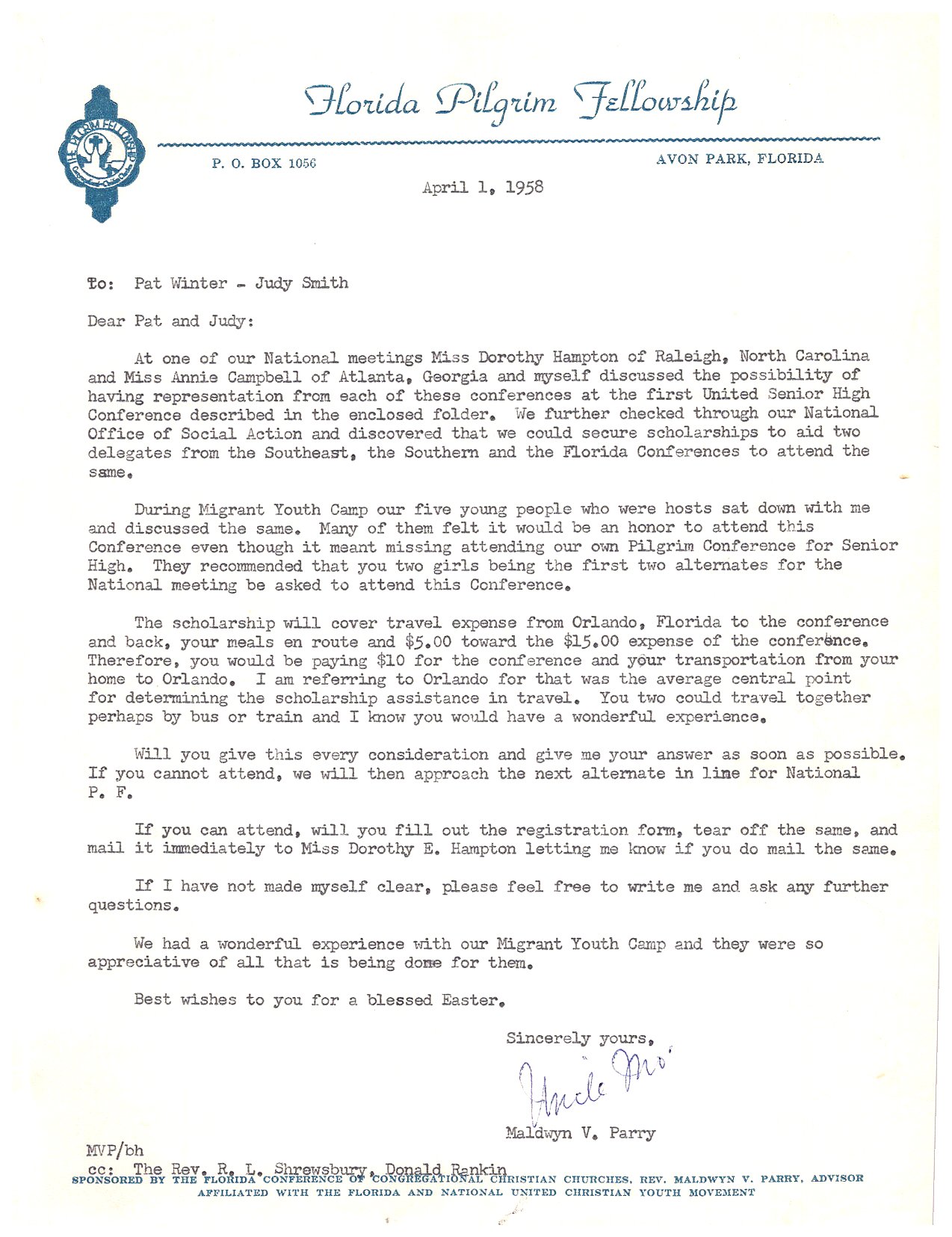 Since Dorothy Hampton's bus travel arrangements ended in Raleigh, she arranged for Pat and Judy to stay overnight in Raleigh with a family that was bringing their daughter to Bricks, however, characteristic of Pat's dad, Robert Winter, he worked his magic and arranged elaborate bus reservations that would take them all the way to Bricks, hence they declined Miss Hampton's offer. Pat and Judy were to return a day early in order to make a report on their trip to the Senior High Conference in Avon Park.