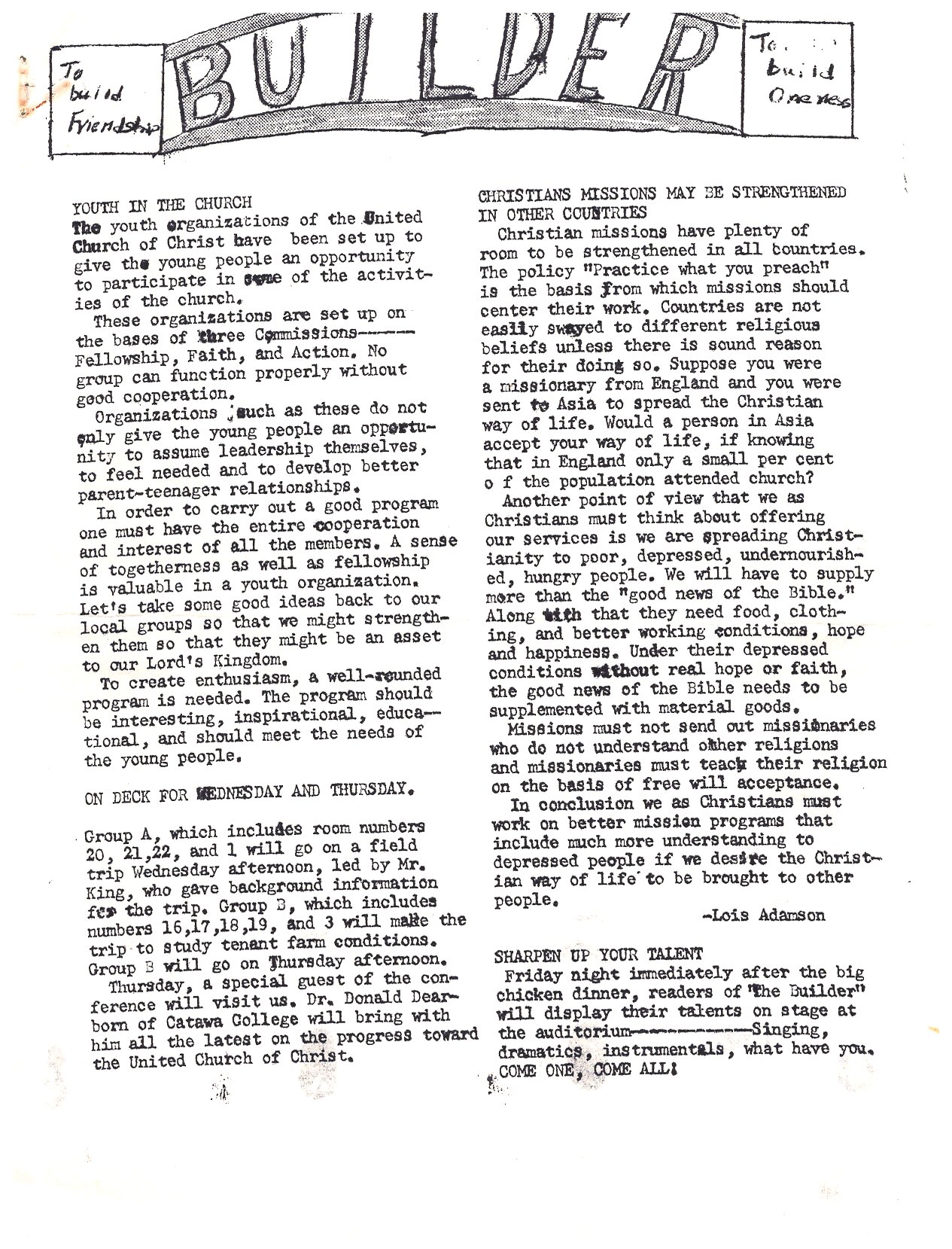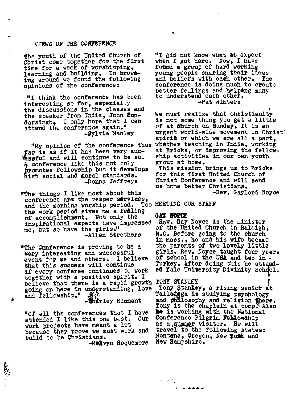 Judith Smith Greavu, who became a successful sculptor who taught at Ohio Northern University, recalls, "I do remember the visit to the tenant farmer camp and my social conscience was forever changed by those experiences and the Union Congregational awareness of another way to approach race relations beyond what was encouraged by most of the Florida population and even preached by many of the churches."