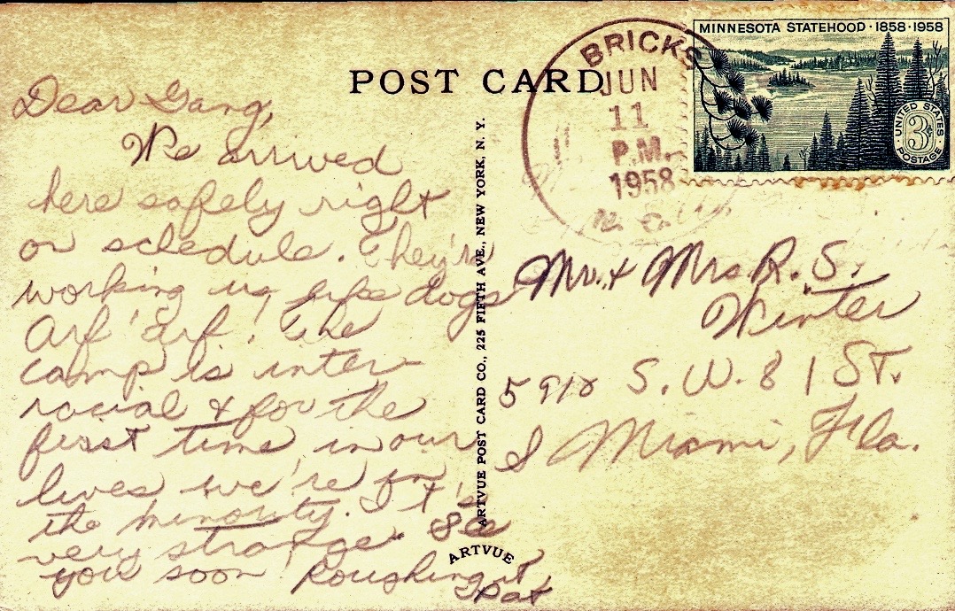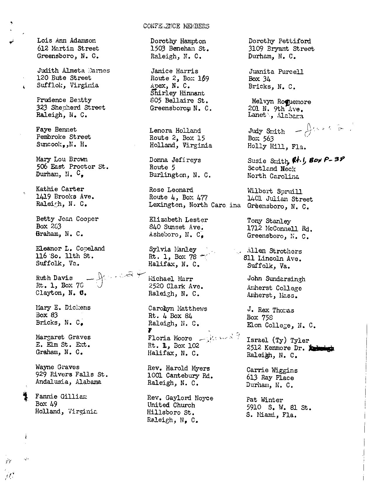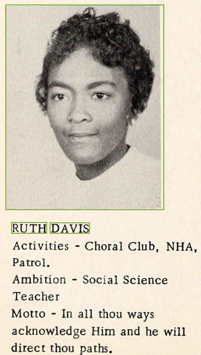 Pat tells the following story: On the last leg of the bus trip, a Black girl got on the bus. She told the driver that she was going to Bricks. Pat's assumption was that she was likely part of the kitchen staff. Upon arrival she learned that the girl was her roommate. Pat, at that moment, recognized her racism, something she had been unaware of in her largely White Miami community. Below, I offer suggestions that the roommate could have been Ruth Agnes Davis or Floria Moore since Pat recorded their birthdays on the attendees list.