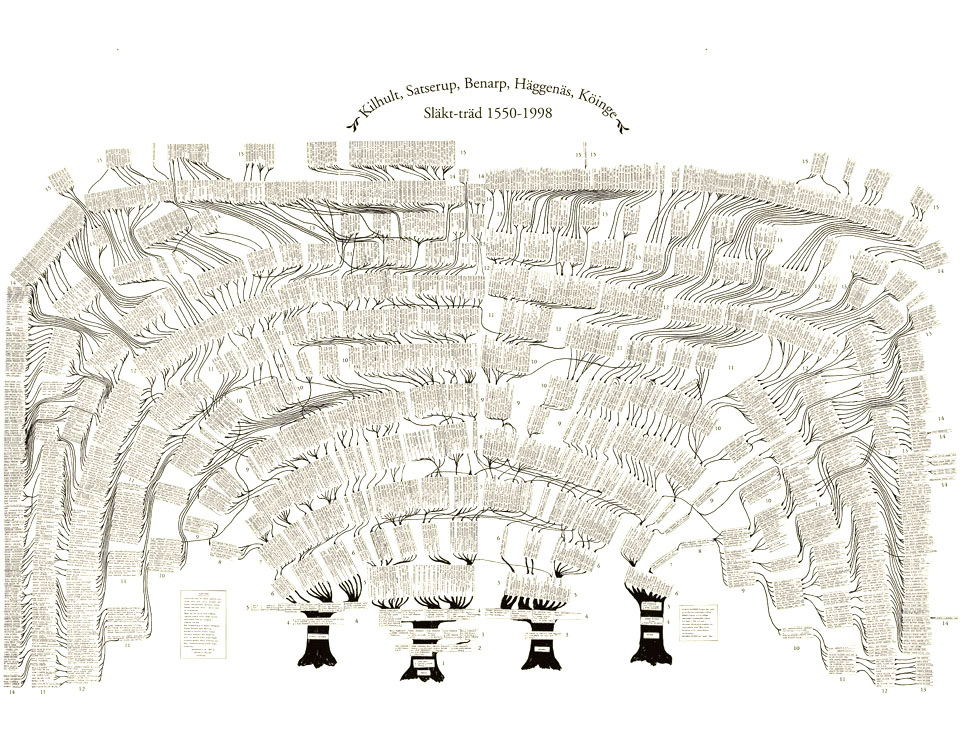 This is hand-drawn genealogy tree done for four villages in Sweden. It is part of my colleague and friend, Roger Bengtson’s family. A relative in Sweden did the drawing. Roger’s scan permits zooming to a very detailed level. Sadly that version is too large to include here. You can, however, see more detail by opening this Large Version Here: Bengtson Family Tree a clicking on the image to magnify a section.
