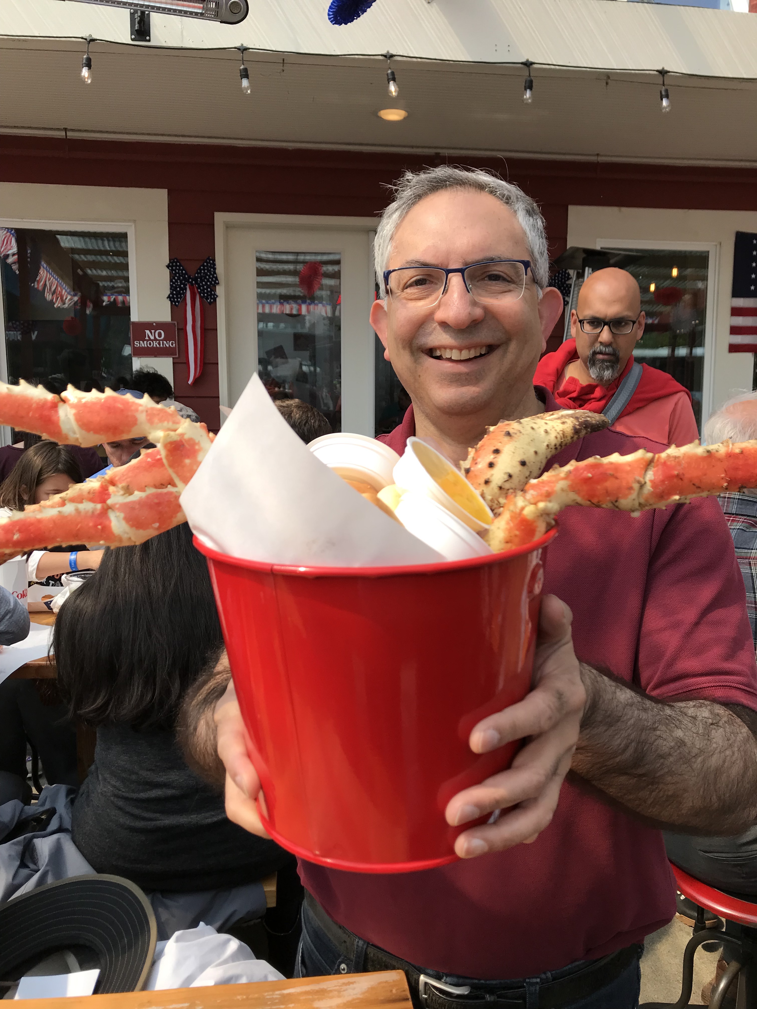 Firoz Antia and Alaskan Red King Crab. Amit Sarma in background. Tracy King Crab Shack, Juneau, Alaska