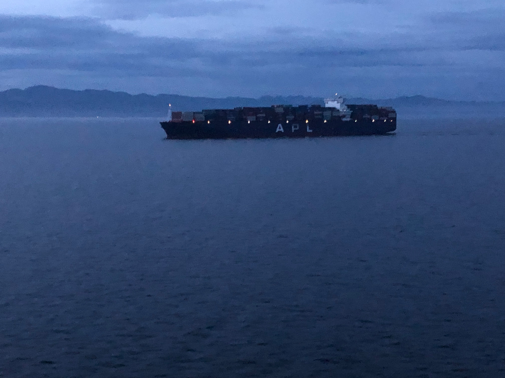 Container ship seen from Oakes balcony first night out of Seattle.