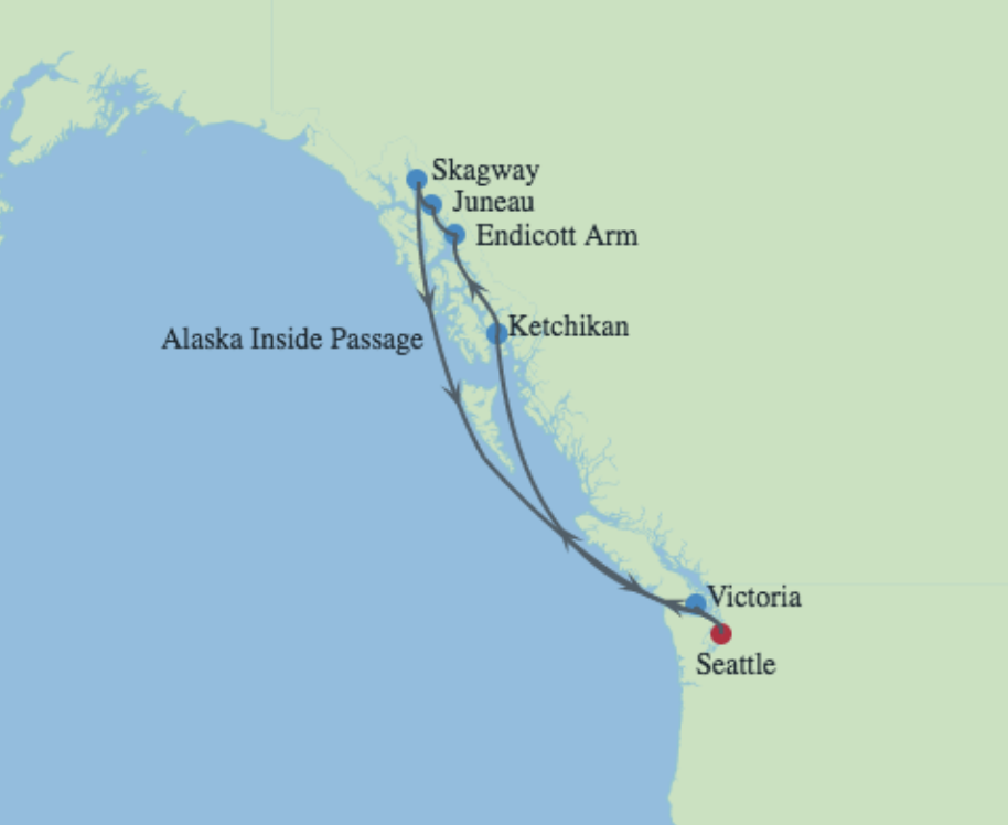 The cruise was with the Celebrity cruise line on their ship Solstice. It was for seven nights "Alaska Glacier Cruise" departing from: Seattle, Washington. Ports of Call: Ketchikan, Alaska • Cruise Endicott Arm & Dawes Glacier • Juneau, Alaska • Skagway, Alaska • Cruise Inside Passage, Alaska • Victoria, British Columbia.