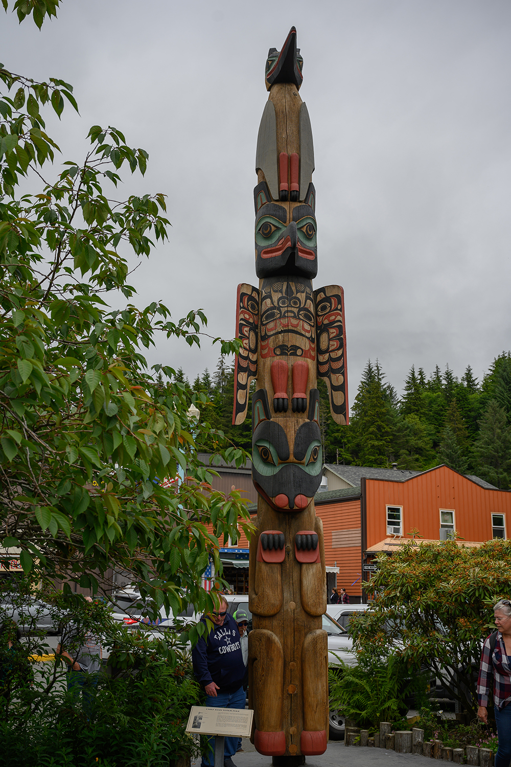 Mel and Pat Oakes, Tlingit-style totem pole, Potlatch Park, Ketchikan. The Tlingit people, whose name means "People of the Tides", have a vast history; many speculate its origins dating as early as 11,000 years ago. Two major theories exist as to where the Tlingit people originate from, the largest being a coastal migration across the Bering Strait land mass from north Asia. Others, however, believe that the Tlingit people may have migrated from Polynesia by island-hopping. However, it is not disputed that the Tlingit settled along Southeast Alaska thousands of years ago. For these many years, they lived a hunter-gatherer lifestyle, subsisting off of the abundant Alaskan wildlife in a fashion few still continue today. The Tlingit people shared relations with the neighboring Haida and Tsimshian tribes, as they do in the modern era. These peoples traversed the area with large canoes of red cedar, often averaging sixty feet in length. Trading their prized Chiklat robes, shells, and jewelry, they received well-crafted canoes and sturdy cedar trees from the Haida lands. However, times were not completely peaceful; the tribes fought and raided each other’s villages for riches and slaves.