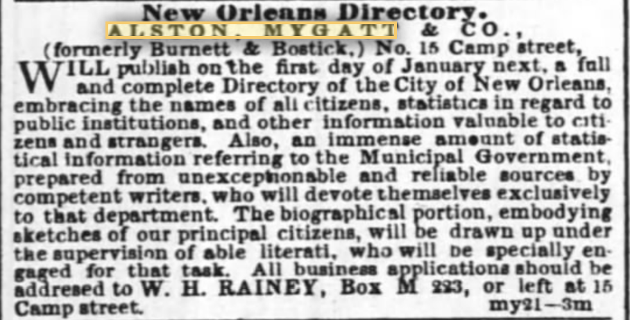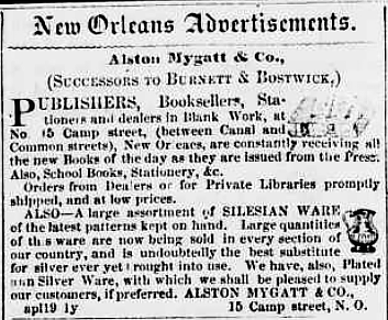 In the April 26, 1856,Thibodaux Minerva (Thibodaux, Louisiana) newspaper the following appears under "Advertisers": Books, etc—Messrs. Burnett & Bostwick have been succeeded in business by Alston Mygatt & Co, at No. 15 Camp street, New Orleans. We particularly call attention to their cadr in our columns this morning. A large and choice assortment of Silesian ware always on hand. We cannnot too highly recommend this establishment to the favorable consideration of our readers. All of the latest publications may be had of Messrs. A. M. & Co., simultaneous with their appearance at the north, at a very triffling advance on cost.