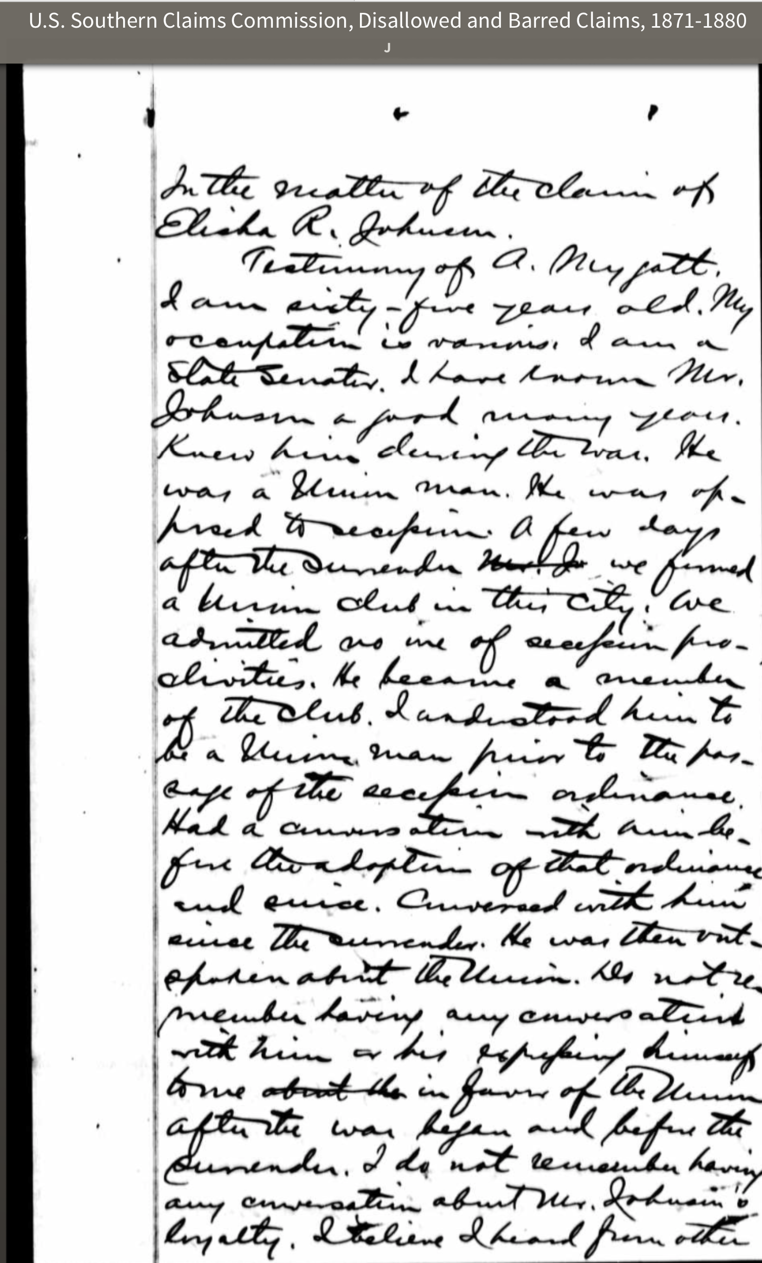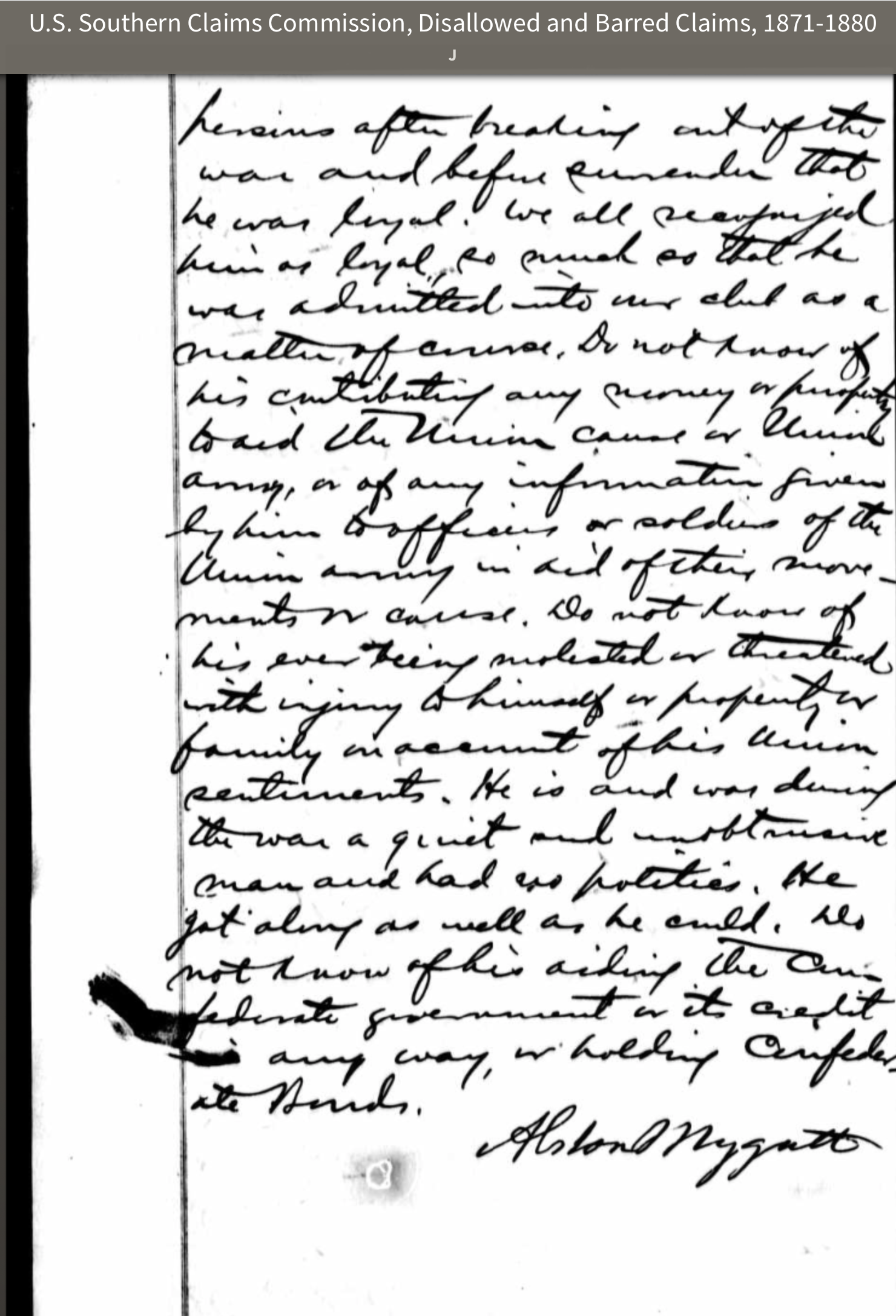 On June 17, 1871, Elisha R. Johnston, a shoemake and farmer, filed a claim with the Southern Claims Commission (#2605) asking the U.S. government to reimburse him $374.50 for items lost in the Civil War. On the form he claims to be 52, five feet, eight inches tall with brown eyes. He made a claim against the U. S. Governmnt for confiscation of property by the Union Army. Elisha said he had be opposed to succession and had be loyal to the Union throughout the war. He attempt to recover payment for loss of horse and saddle, barrells of corn and fodder. It is about $371. To support his claim he brings witnesses to his losses and to his loyalty to the Union. One of th witnesses is Alton Mygatt. We are fortunate to have Alston's testimony in his own handwriting, including his signature. Alston also served as a witness for Olivia F. Montgomery in her October 1873 claim of $10, 350 before the U. s. Southern Claims Commision. This claim was also rejected.