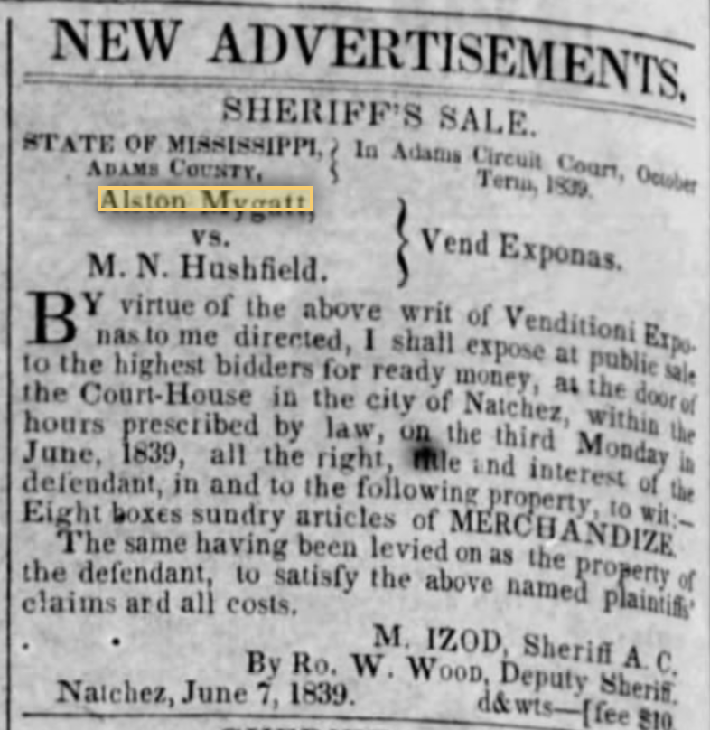 In September of 1867, a notice of bankruptcy against the estate of Alston MyGatt appears in The Weekly Democrat (Natchez, MS). This paper is blatantly racist and anti-Radical Republican, consequently, not sure what to make of this announcement.