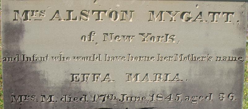 Alston Mygatt Sr. married Effa Maria Van Epps on November 2, 1835, in Oneida, New York. He and Effa had three children, Alston Jr. (born 1838 in South Carolina–1880), Elizabeth (1839–) and Maria Elizabeth (1843–1913). Effa died in childbirth on June 17, 1845, in Vicksburg, MS. She is buried in Lot 5 of Square 25 of Div B, All Tombstones. Mygatt(sp?), Mrs. Alston of New York and her infant who would have borne her mother's name, Effa Maria, age 36 yrs, three infants preceded her. ?- 17 Jun 1845. Hay, William 10 Aug 1806 - 20 Aug 1849.