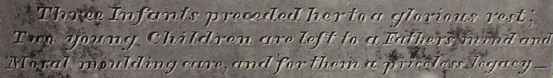 Transcription of above, "Three Infants preceded her to a glorious rest: Two young Children are left to a Father's mind and Moral moulding care, and for them a priceless legacy."