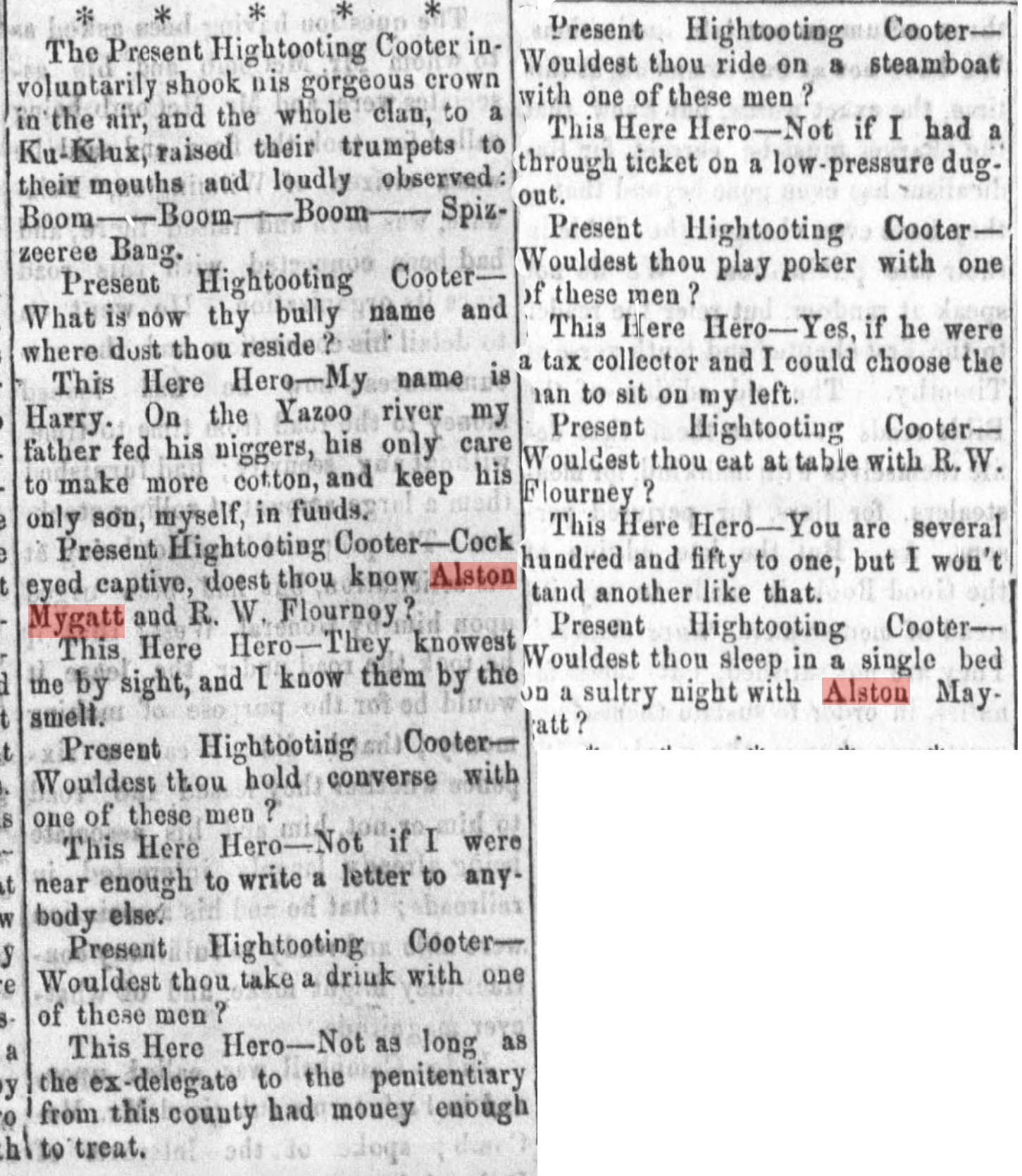 On April 14, 1866, a pathetic article appeared in the Vicksburg Herald newspaper providing an account of an initiation ceremony by the Ku Klux Klan. Part of the condition for membership was to slander R. W. Fournoy and Alston Mygatt, representative to the Mississippi Constitional Convention. The article mentions the punishment for "plotting with a nigger under a gin house": the Klan head says, "Pull his toenails out and ram his head in a bee gum." The Klan members shout "Boom, Boom, Boom."