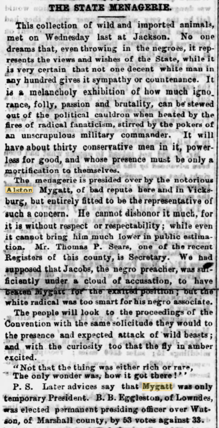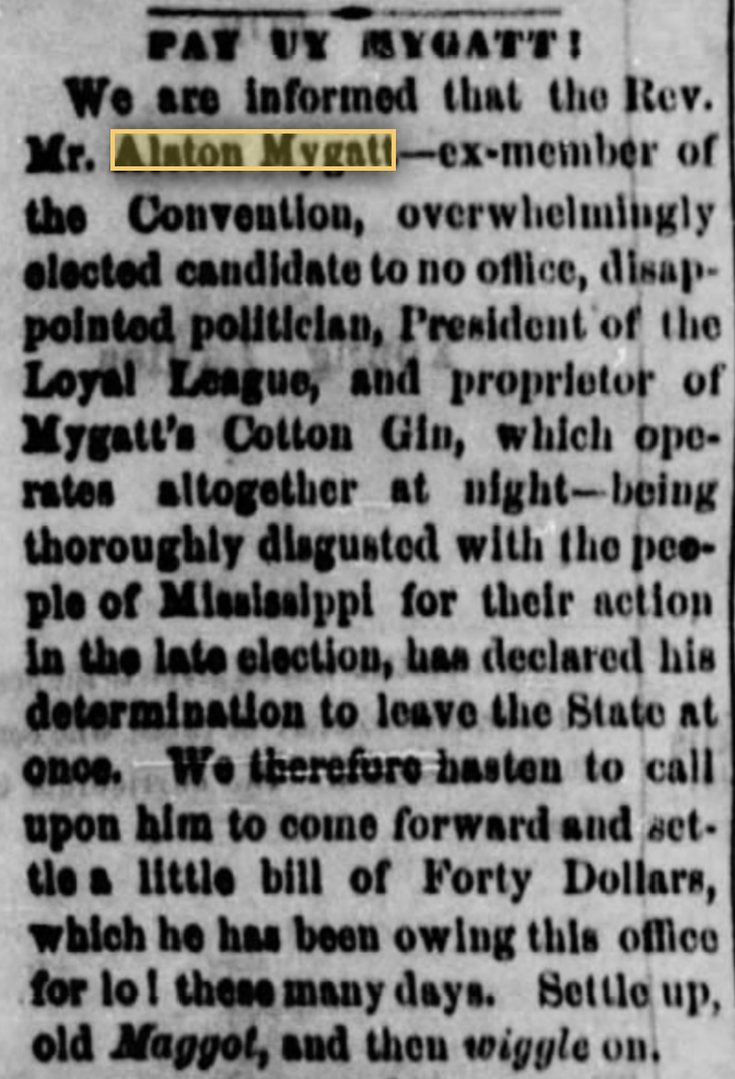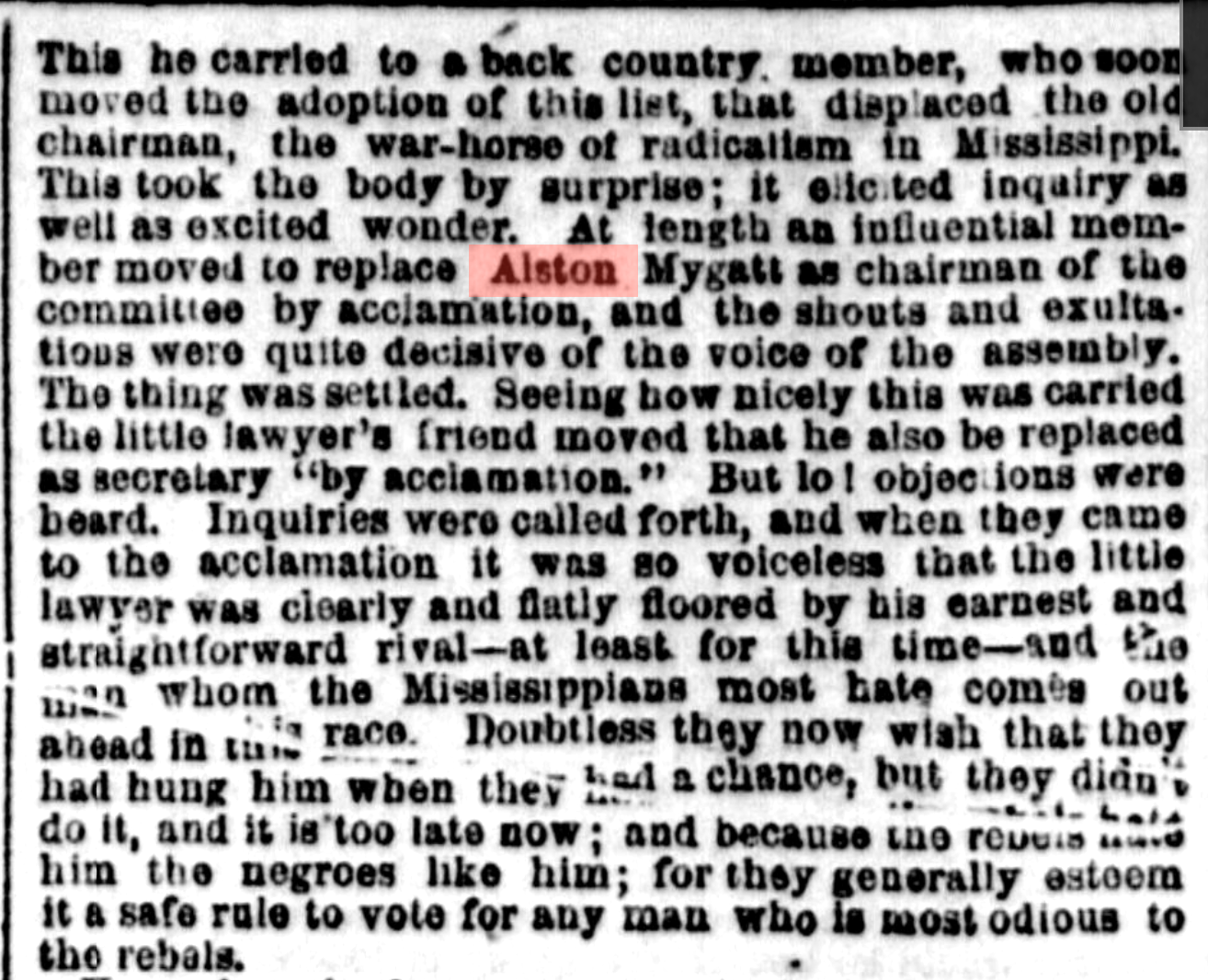 In July 7, 1868 issue of the Louisville Journal, it is reported, "Rev. Alston Mygatt, a prominent carpet-bagger is so thoroughly disgusted with the people of Mississippi for their action in the late election that he has determined to leave the State at once." The paper's is very anti-Negro and doesn't condemn violence against them by Whites. No evidence that Mygatt left the state. In fact he was elected to the state senate. The report was based on an article published in the Vicksburg Herald seen at right.