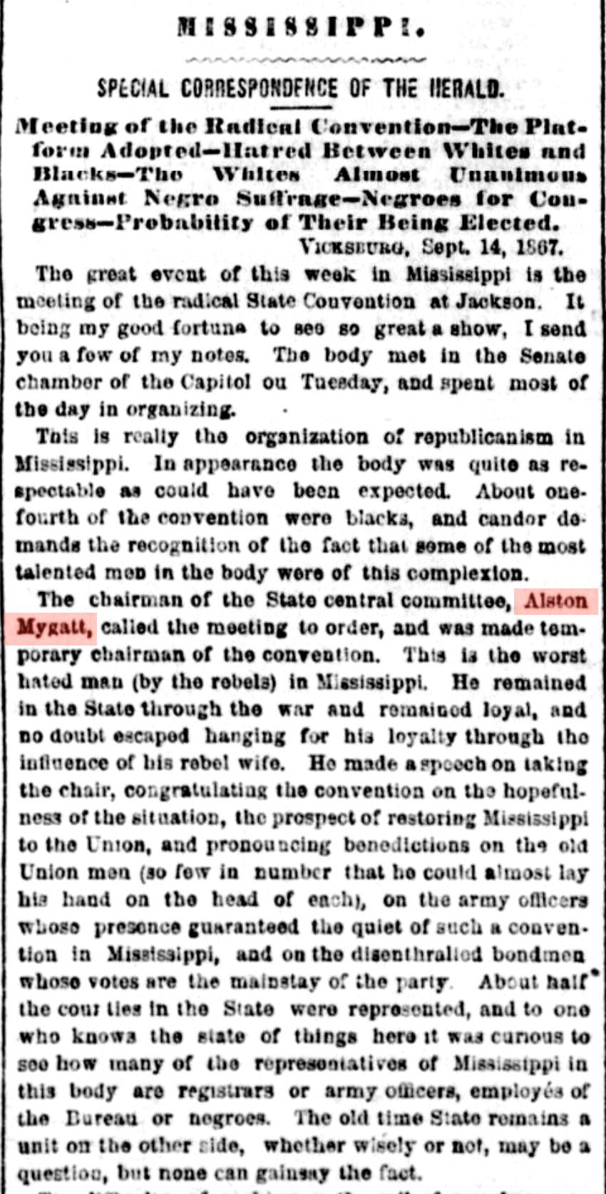 On September 25, 1867, an article is published in the New York Herald by a correspondent who attended the opening of the Mississippi Constitutional Convention. Here are excerpts relavent to Alston Mygatt: