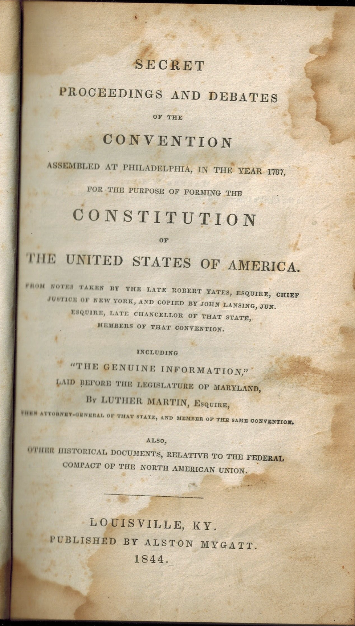 In 1844, Mygatt published, "Secret proceedings and debates of the convention assembled at Philadelphia, in the year 1787 : for the purpose of forming the Constitution of the United States of America" / from notes taken by the late Robert Yates, esquire, chief justice of New York, and copied by John Lansing, jun., esquire, late chancellor of that state, members of that convention ; including"The genuine information," laid before the legislature of Maryland, by Luther Martin, esquire, then attorney-general of that state, and member of the same convention ; also, other historical documents, relative to the federal compact of the North American Union. Mygatt published from Louisville, KY.