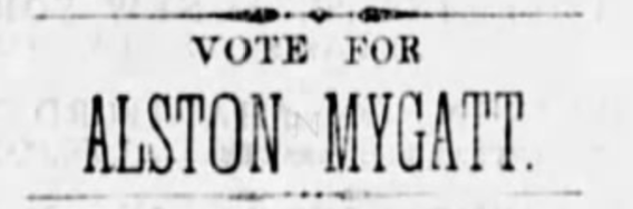 In the August 6, 1865, the Vicksburg Journal newspaper, the following appeared, "For the city of Vicksburg, Altson Mygatt, ESQ.. We are authorized to announce the name of ALSTON MYGATT, Esq., as a candidate to represent the city of Vicksburg in the constitutional convention, to be assembled at Jackson on the 14th instant. The paper goes on to endorse Alston, "In urging our friends to vote for Mr. Mygatt, we have merely this to say: As a man, he is wholly unexceptionalble, his character, long established in this community, is above reproach. Widley known in this State and abroad, his election will be an assurance to the Union men here and elsewhere, that Vicksburg is, as she has long claimed to be, "loyal to the core."