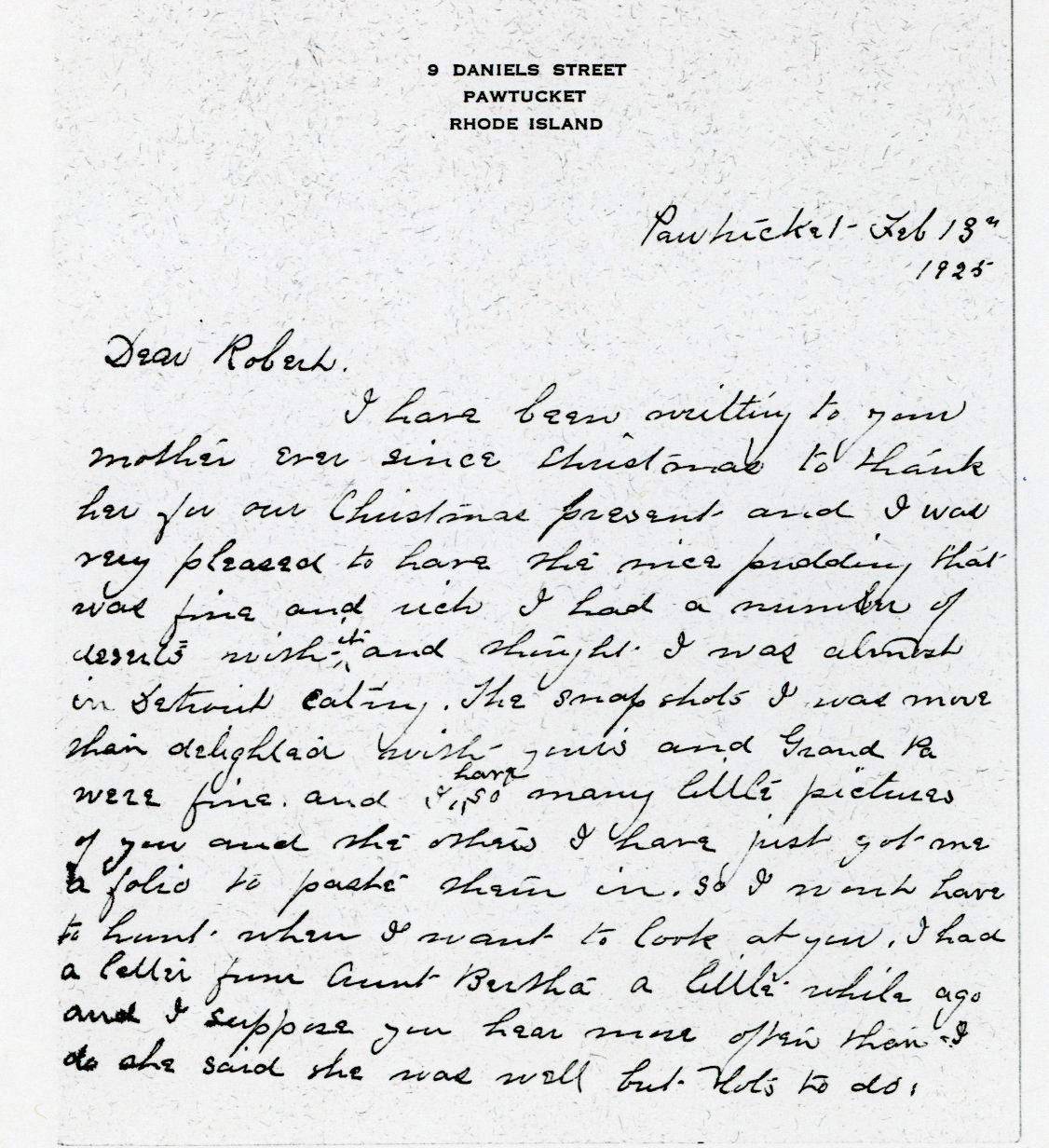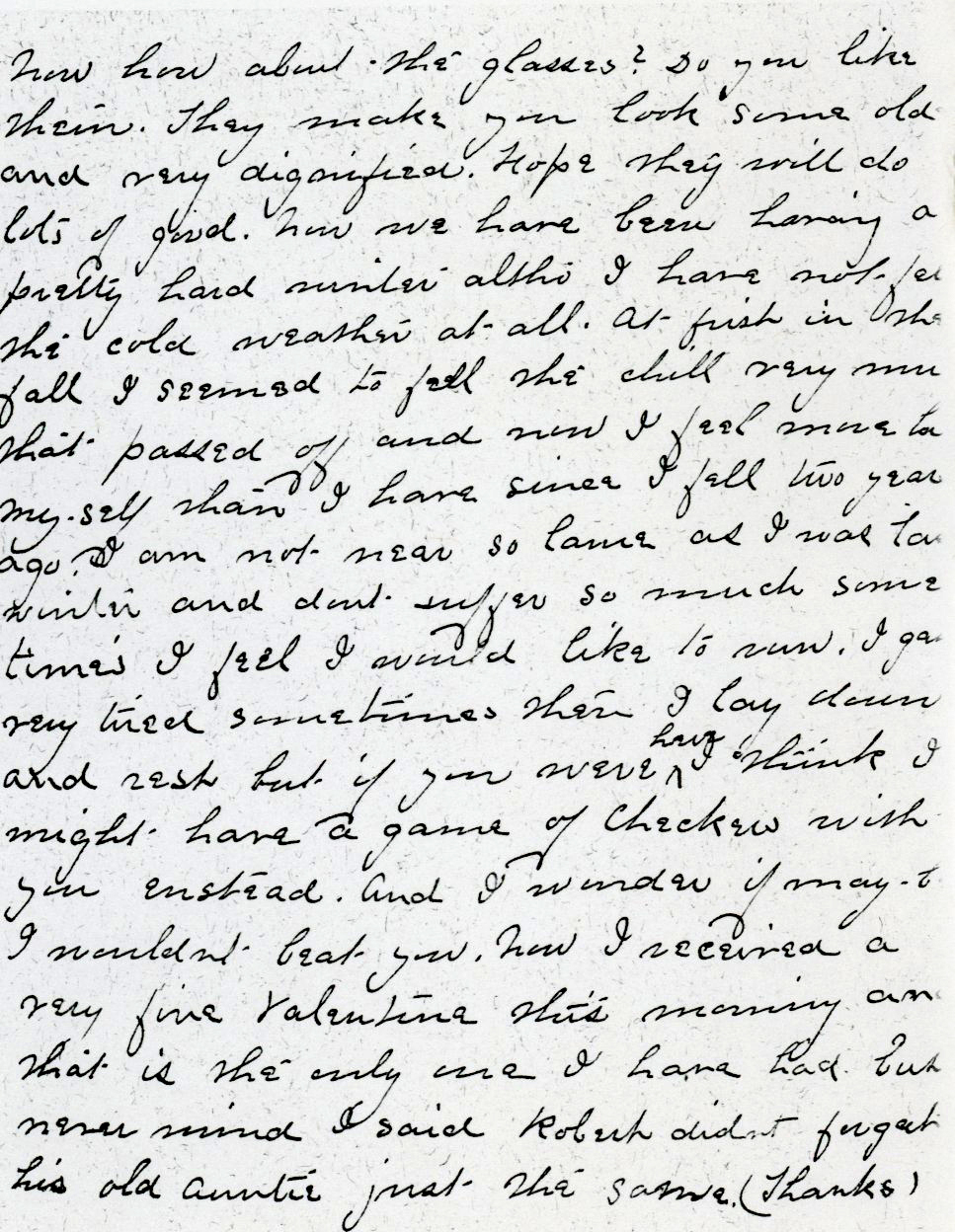 I have been ? to your mother ever since Christmas to thank her for our Christmas present and I was very pleased to have the nice pudding that was fine and rich, I had a number of desserts with it and thought. I was almost in Detroit eating. The snapshots I was more than delighted with—your's and GrandPa were fine and I have so many little pictures of you and the others, I have just got me a folio to paste them in, so I want have to hunt when I want to look at you I had a letter from Aunt Bertha a little while ago and I suppose you hear more often than I do she said she was well but lots to do. Now how about the glasses? Do you like them. they make you look same old and very dignified. Hope they wil do lots of good. Now we have been having a pretty hard winter altho I have not felt the cold weather at all. At first in the falll I seeme to feel tha chill very much. That passed off and now I feel more like myself than I have since I fell two years ago. I am not near to lame as I was last winter amd don't suffer so much, sometimes I feel I would like to run. I get very tired sometimes then I lay down and rest, but if you were here I might have a game of checkers with you instead. I wonder if I wouldn't beat you Now I received a very fine Valentine this morning and that is the only one I have had, but never mind. I said Robert didn't forget his old auntie just the same. (Thanks)