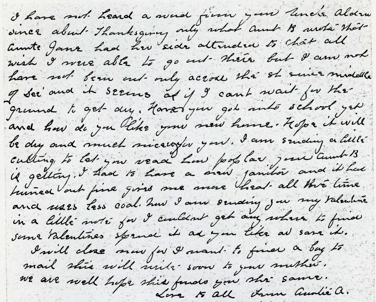 I have not heard a word from you Uncle Alden since about Thanksgiving only what Aunt Bertha that Aunte Jane had her side attended to that all wish I were able to go out there, but I am not—have not been out, only across the street since middle of Dec. and it seems as if I can't wait for the ground to get dry. Have you got into school yet and how do yoou like your new home. Hope it will be dry and much nicer for you. I am sending a little cutting to let you read how popular your Aunt Bertha is getting. I had to have a new janitor and it had turned out fine gives me more hear all the time and uses less coal. Now I am sending you my Valentine in a little note for I couldn't get anywhere to find some Valentines. Spend it as you like or save it.