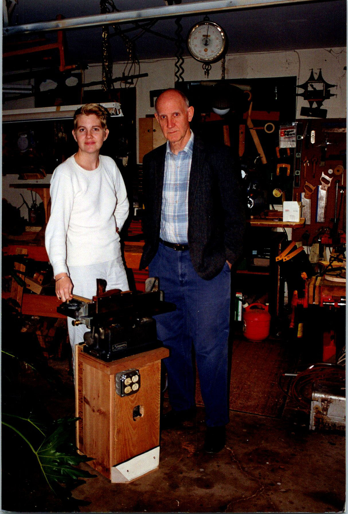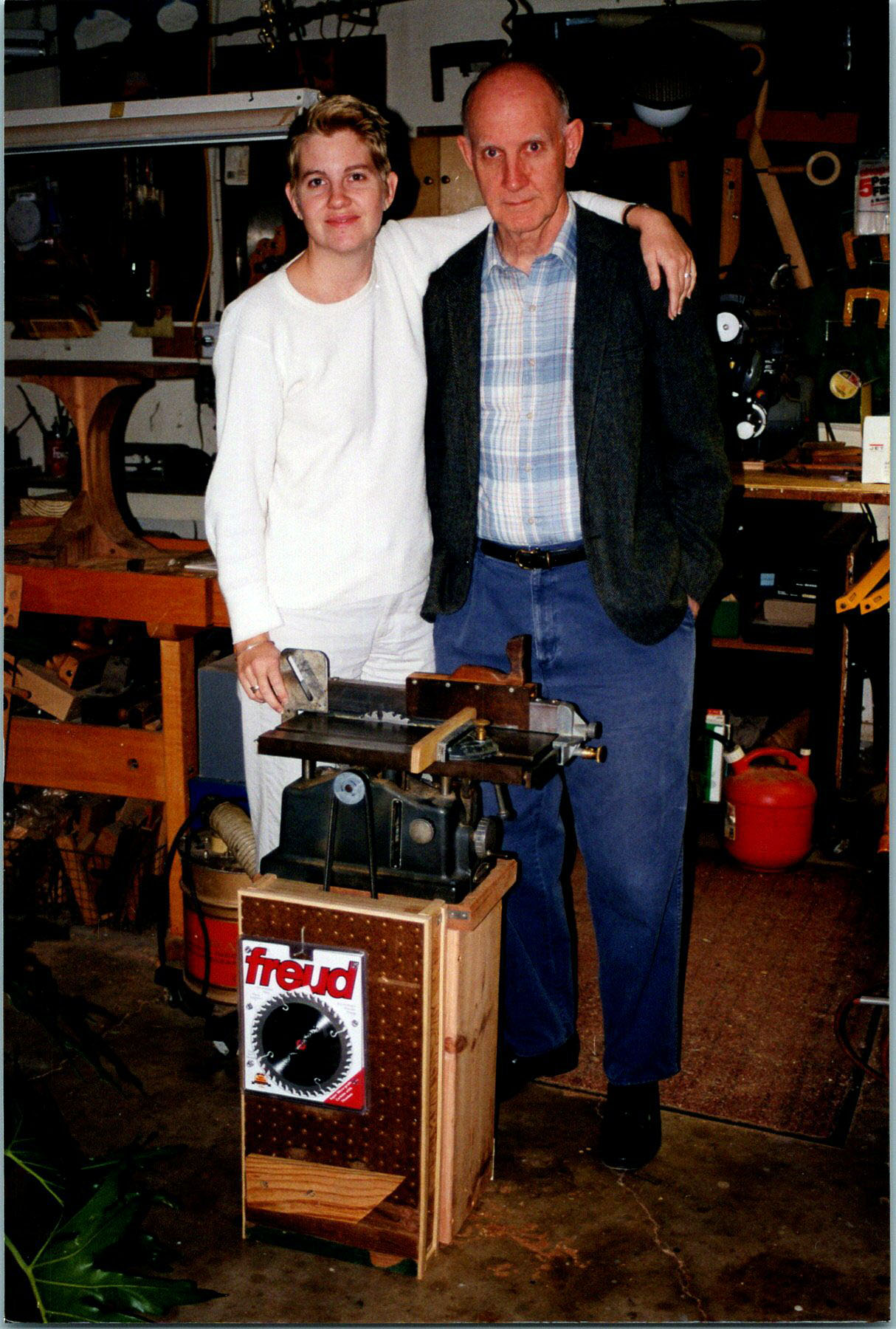 Mardie and Mel with Grandpa Winter's table saw and stand Mel built for it. Feb. 1999