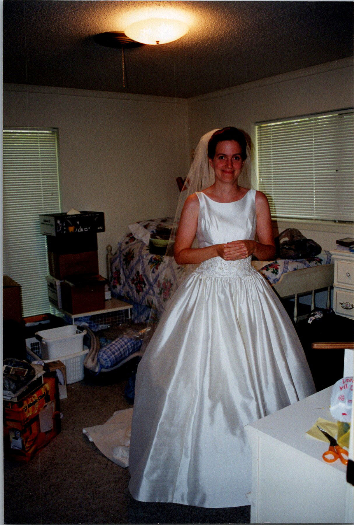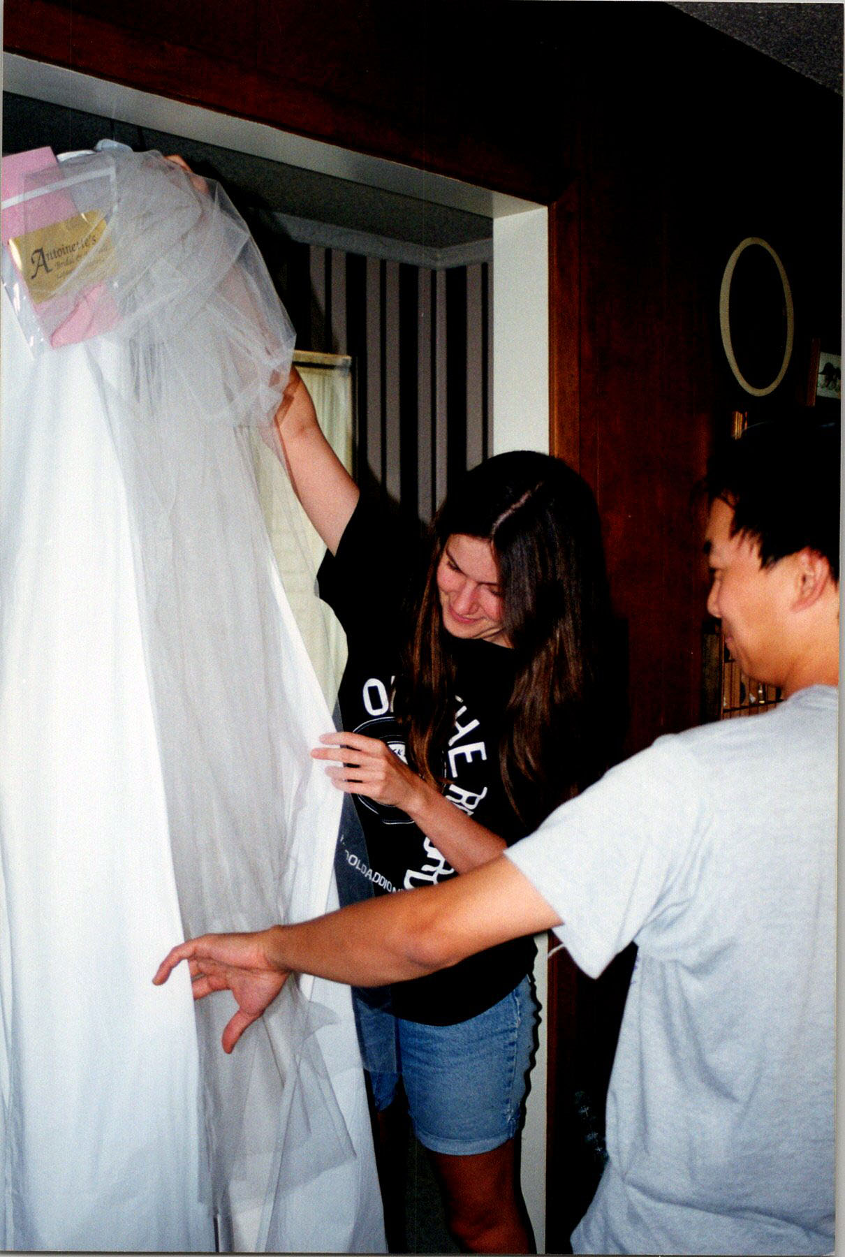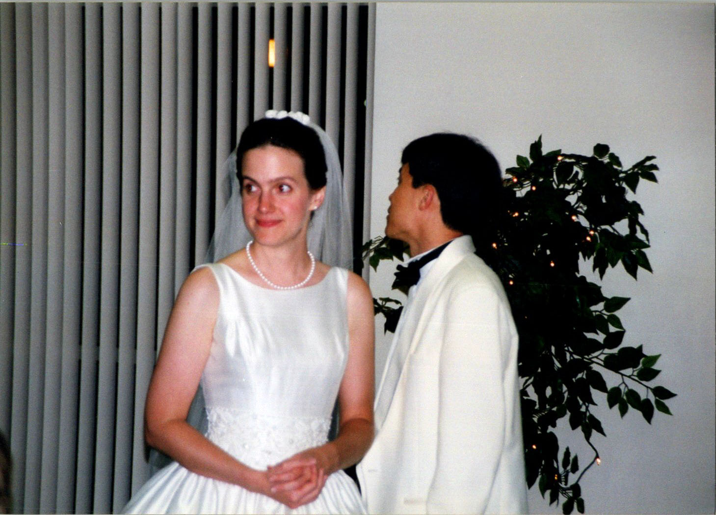 Beth getting veil advice from Amos Yang.