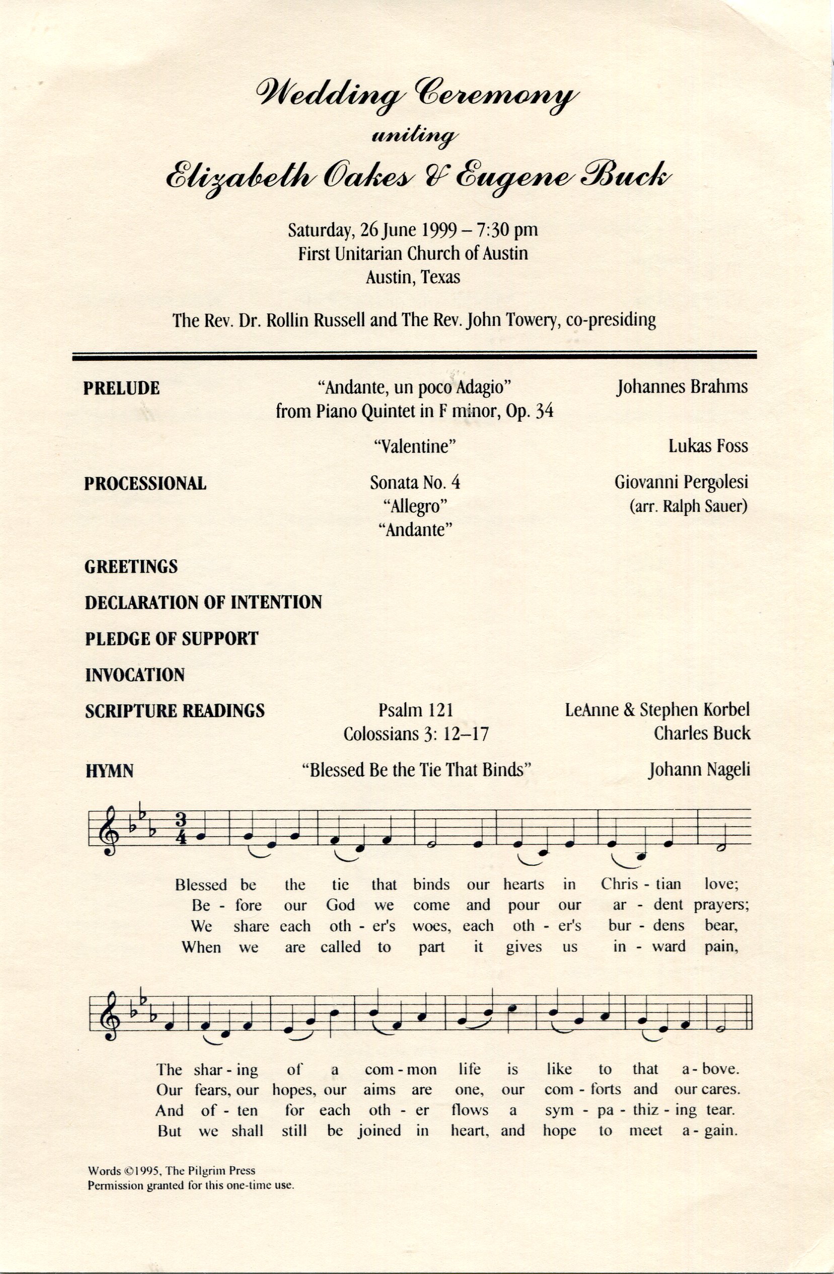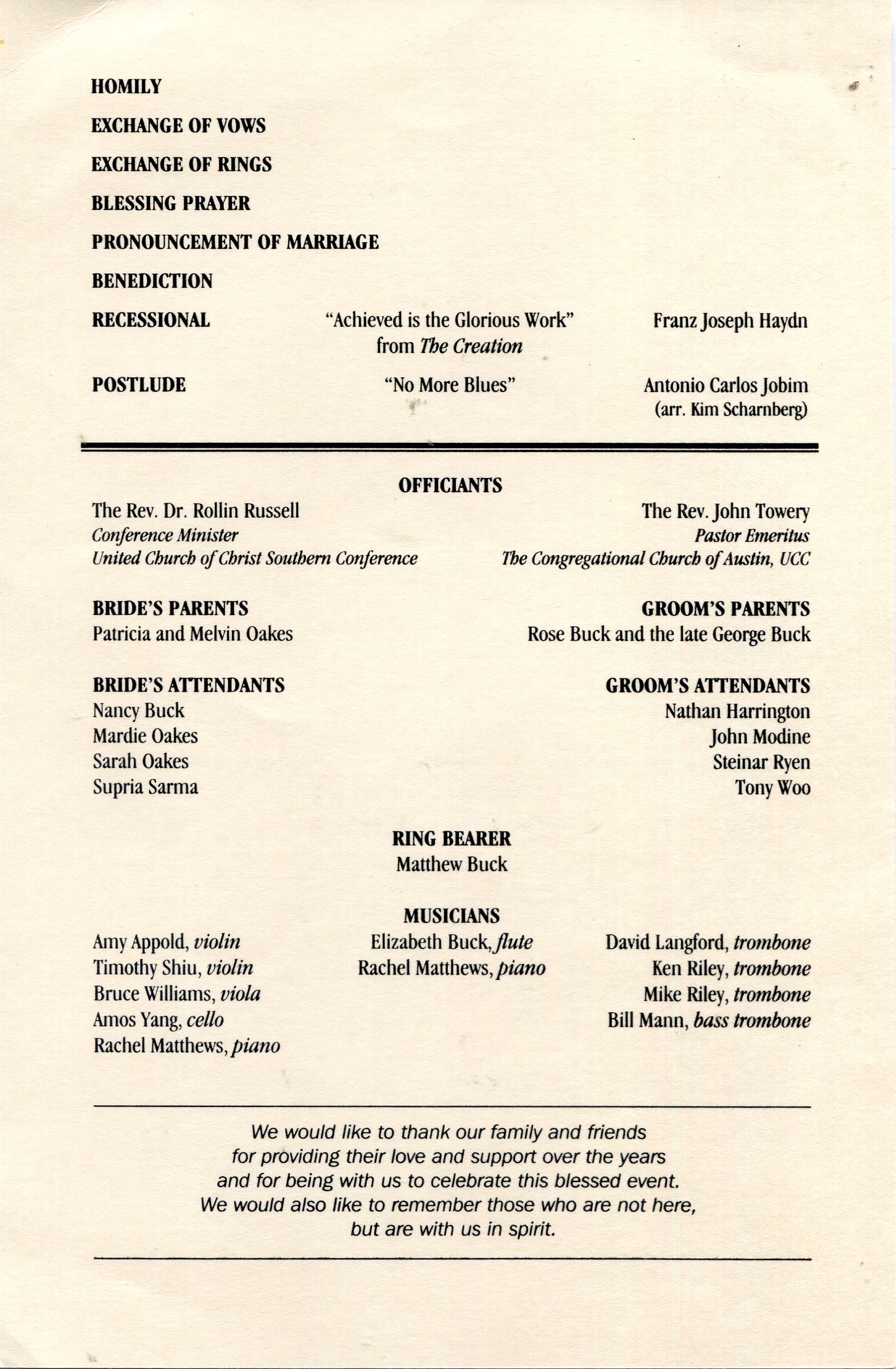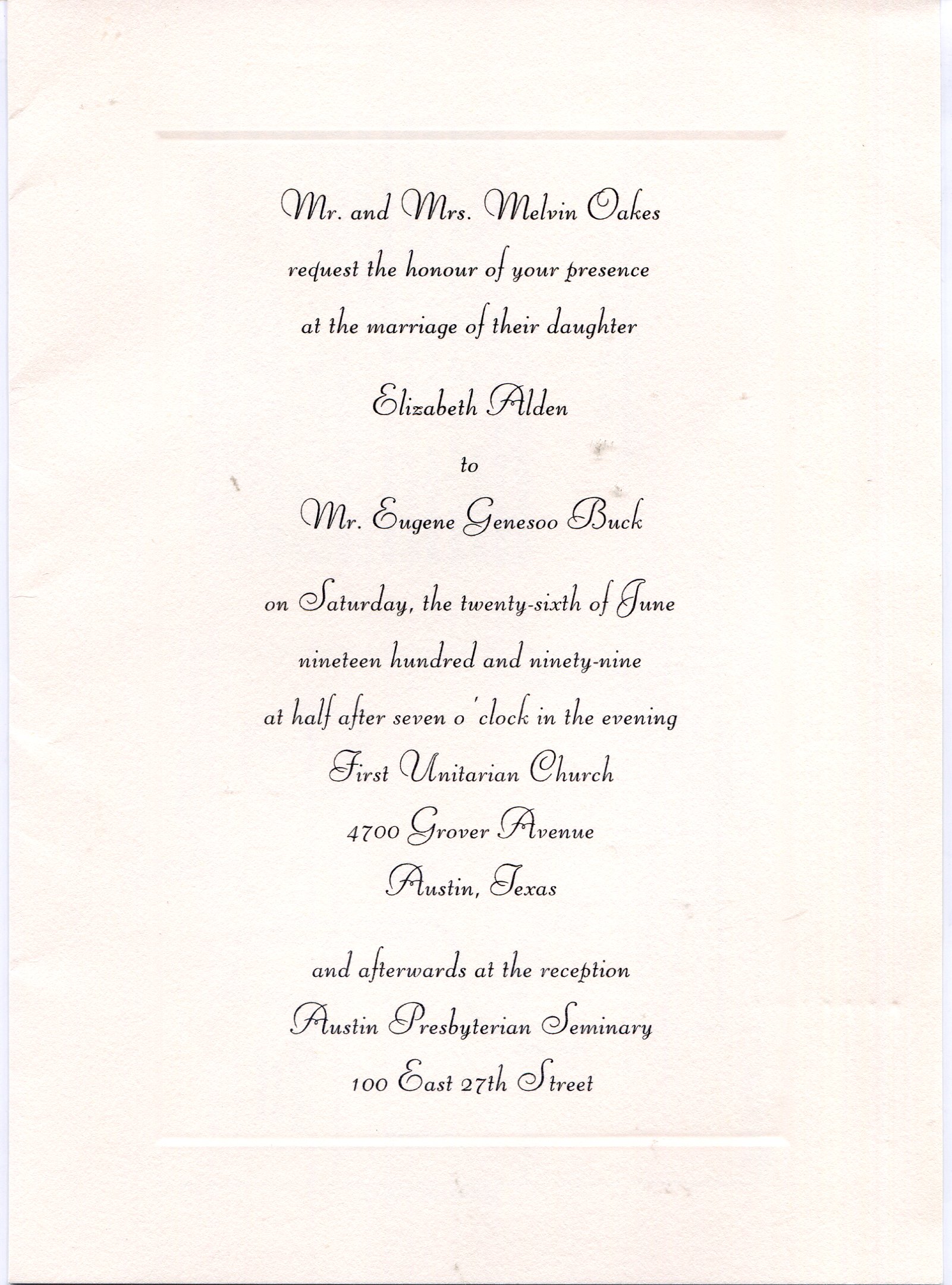Introduction Eugene Buck and Elizabeth Oakes were married in Austin, Texas, on June 26, 1999, at the Unitarian Church of Austin. The Congregational Church of Austin was not large enough to accommodate all the guest. The reception was held at the Presbyterian Seminary Reception Room.
