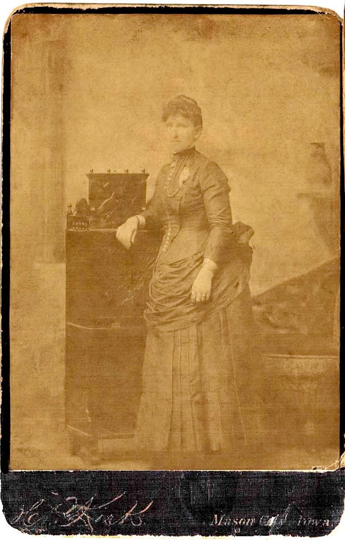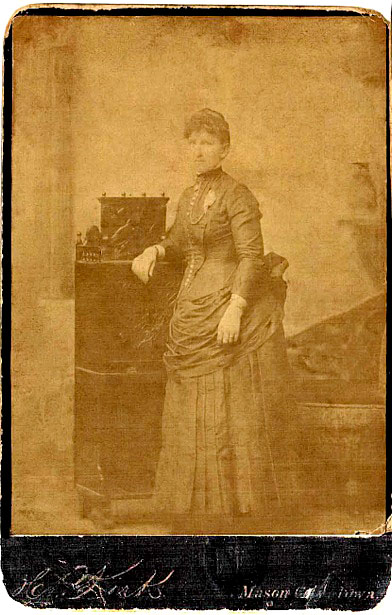 Elizabeth Camellia Bellinger Bliss(1848-95), Camellia is sister of Josephine and Adeline Bellinger, Cabinet Card. 1875-85 Kirk opened his studio in Mason City in 1867 and remained a photographer until about 1900. He became a banker and developer. He is listed in the 1881 Gazetteer as a Mason City photographer. Prominent series included "Views of Mason City and Vicinity" and "Scenery - Mason City and Vicinity." His gallery in 1883 was above Hanford's Clothing Store -west side of Commercial Street. A photo by Kirk of the Central School was displayed at the 1876 Philadelphia Centennial Exposition. |