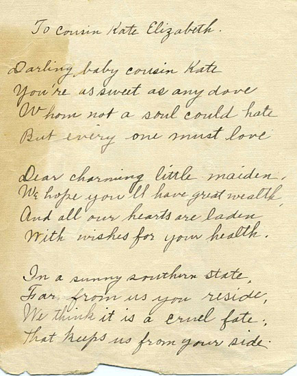Poem written for Katie Elizabeth Bliss by Clara Bliss Royster, this is Clara’s handwriting and it was included with her letters. (Poem provided by Becky Carson, great granddaughter of Clara.) |