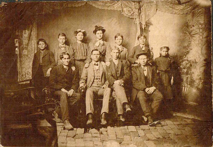 Probably King’s Studio in Vicksburg, clearly same studio as picture of Walter Chanin & Lula Standard Bliss. Front Row L to R: Marion Layfette “Lee” Harrell (1880-1960), George Washington Westbrook (1880-?), William Sam N. Cockrell (1883-1964), Lawrence Edward Rogers Sr. (1870-1941) Standing L to R, Burl Livingston Goss Sr. (1892-1941), ?Cockrell, Fanny Estell Goss (1888-1966), Daisy Lela Goss Cockrell (1883-1944), ?Cockrell, Lee Edgar Goss, (1891-1961), Phenie Magnolia Goss (1894-1984). Based on ages I would say picture is about 1904-05. (Picture identifications courtesy of Nona Keen.) |