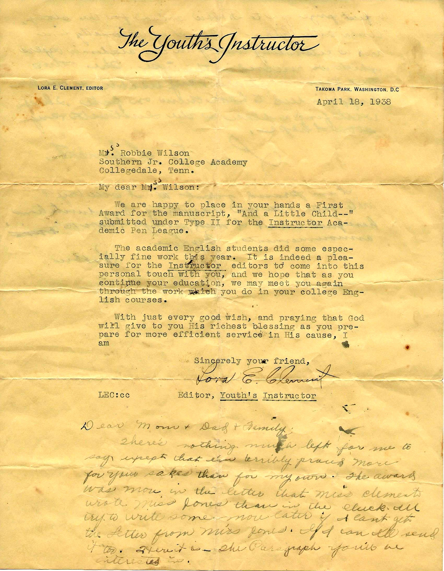While at Southern Jr. College Academy, Robbie Wilson submitted an article to The Youth Instructor, an Adventist magazine. it was accepted. |