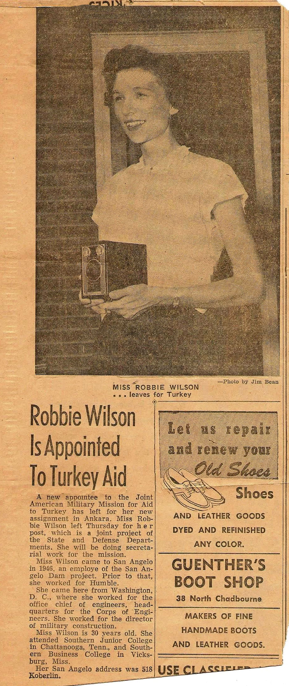 Robbie Wilson, daughter of Robert Mabron and Della Mae Bliss Wilson. Announcement of Robbie Wilson's appointment in Ankara, Turkey. |