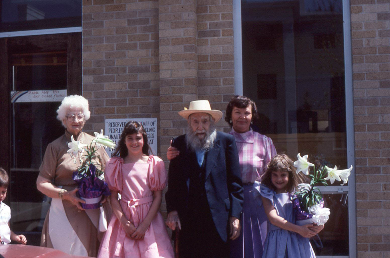 Left to right: ?, ?, Gary Cole, Mabel McNeely?, John McNeely, Bee Poleme |