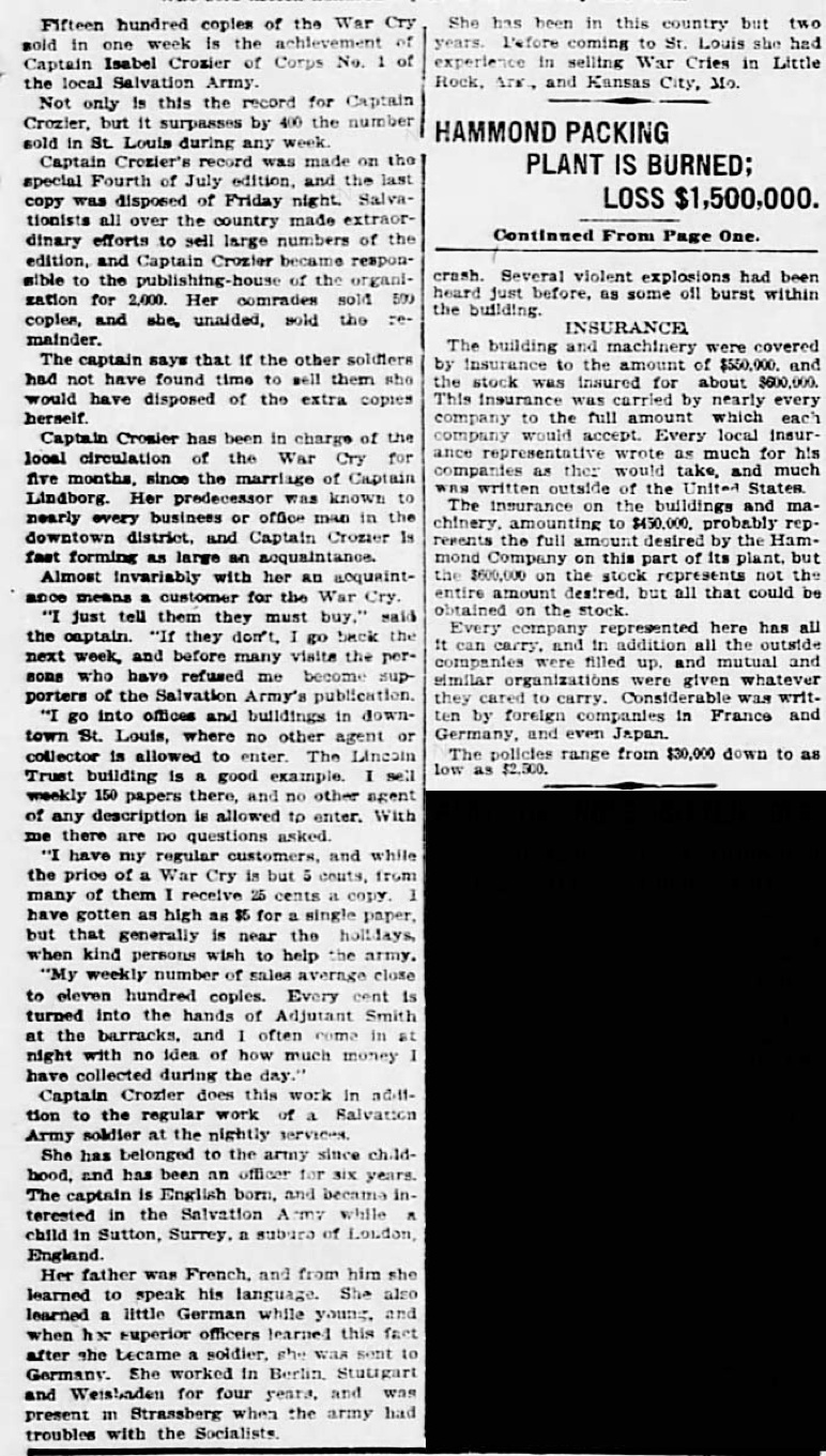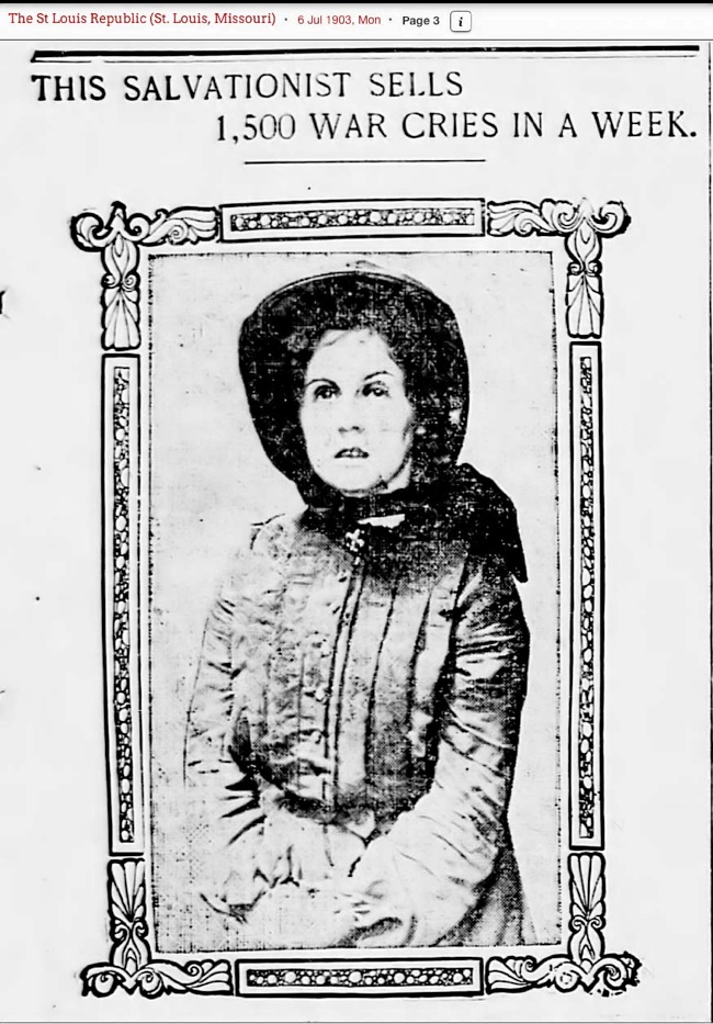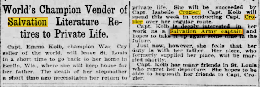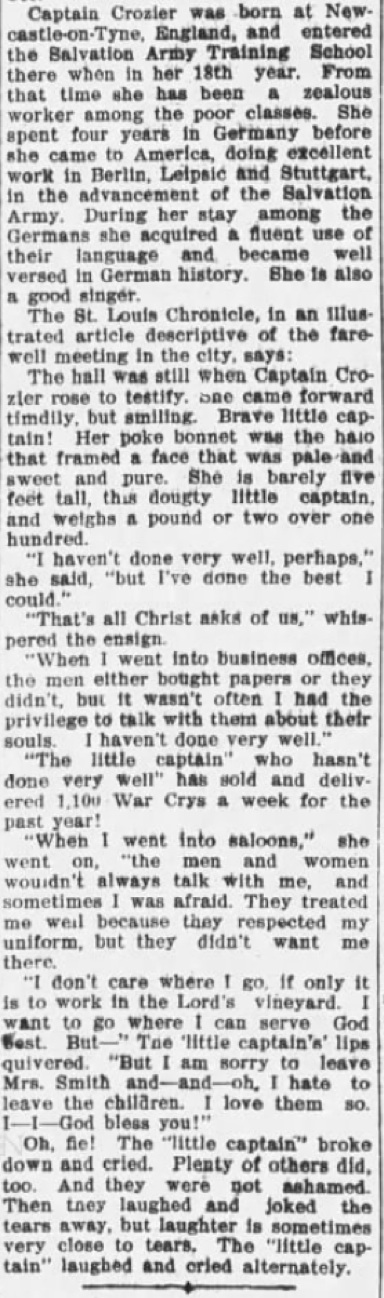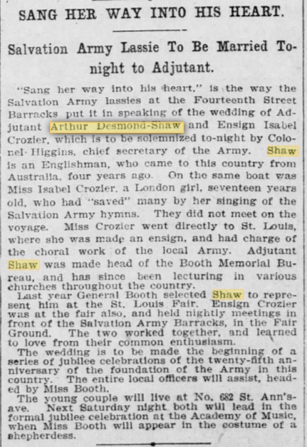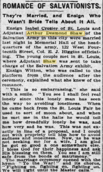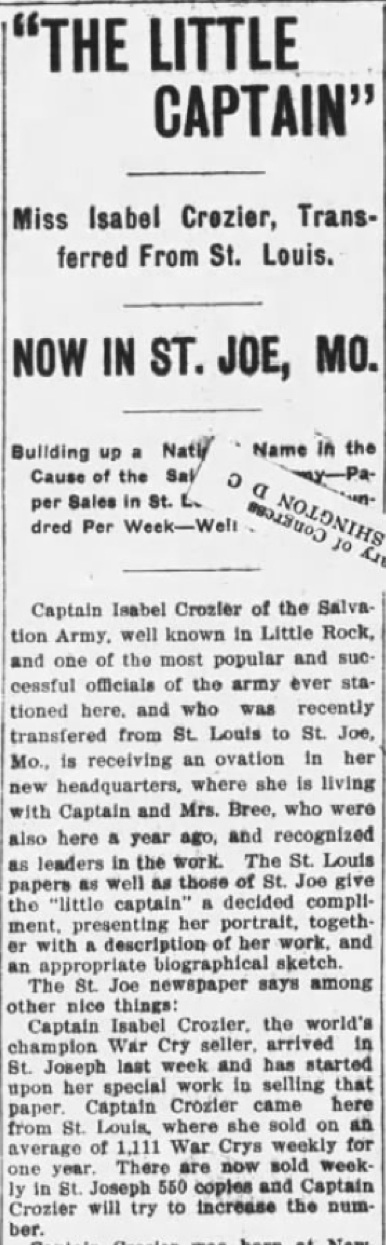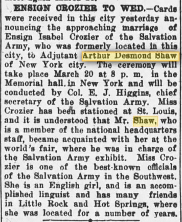 An article appeared in the Tuesday, March 21, 1905, The New York Times about his marriage to Ensign Isabel Crozier of St. Louis. (Likely a recent move as she is in the 1905 St. Joseph, MO City Directory listed as an ensign in Salvation Army. Isabel was born at Newcastle on Tyne, in the town of Banstead, Surrey, England, March 21, 1878. Here are several announcements, the one on the left is from the March 21, 1905, The New York Times and the one on the right is from the Daily Arkansas Gazette (Little Rock). The one below is from the New York Tribune, March 20, 1905.