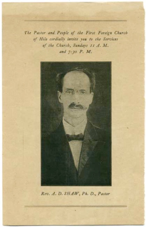Reverend Arthur Desmond Shaw, in 1919 moved from Honolulu, Hawaii to Austin, TX. He started his ministry in Austin October 1, 1919, with the intention of remaining one year. His salary was $2000/yr. He had been the pastor of the First Foreign Church of Hilo. He resided at 506 Puueo Avenue, Hilo. Arthur, Isabel and 10-year-old son, Leslie, left Hilo in September, 1919 for the trip to Austin.