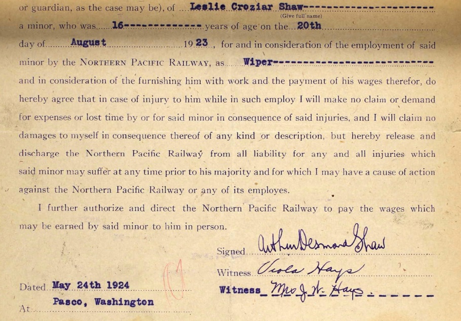 In 1930, Shaw was a Congregational minister in Cathlamet, Wahkiakum County, Washington. He and his wife were both 24 when they married, making the year about 1905, shortly after arriving in US. Isabella’s mother was born in Scotland. This census has her immigrating in 1910, clearly an error. Their son, Leslie Crozier Shaw, was born August 20, 1908, in San Jose, CA. Attached is an interesting document that his father signed for his employment. Leslie died September 16, 1963 and is buried in Mountain View Cemetery, Mountain Home, Idaho. He was a Master Sargent in the US Air Force during World War II. In the 1940 census, he is was living with his mother in Spokane and was a Senior Clerk in City Property Department. He had graduated from college. On December 17, 1945, Leslie enlisted in the Army Air Corps at Geiger Field Spokane. The Term of his Enlistment is “Hawaiian Department.” His civilian occupation was firemen with the fire department. He is single with dependents (maybe his mother). and has completed four years of college. His rank is Staff Sargent.