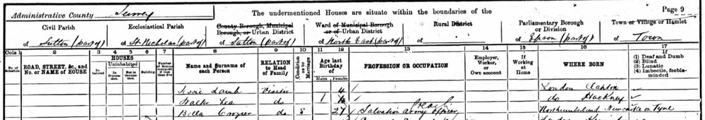 1901 England Census show Isabel (Bella) Crozier working for Salvation Army.