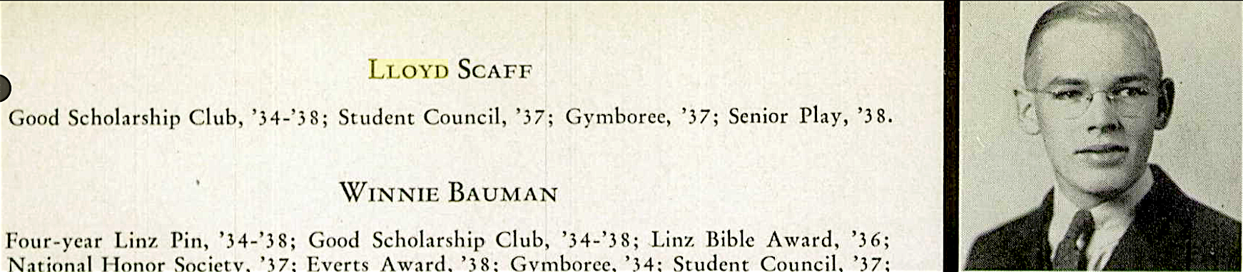 65. Lloyd Scaff, Birth: Jan. 28, 1920, Dallas, Dallas County, Texas, USA Death: 2011 California, USA Age: 91 yrs. Son of Alvin Gilliam Scaff & Ina Vera (Phipps) Scaff, married to Beverly Jeanne (Burton) Scaff (20 Oct 1925-24 Nov 2014); married May 8, 1950, San Francisco, San Francisco County, California, USA. Served in US Army during World War II with status of conscientious objector. Resident of the Rossmoor Senior Community of Walnut Creek. CA. Member of Mount Diablo Unitarian Universalist Church in Walnut Creek, CA. A memorial in his honor was held there at 2pm Saturday, January 28, 2012. Family links: Parents: Alvin Gilliam Scaff (1888 - 1956) Spouse: Beverly Jeanne Burton Scaff (1925 - 2014)* He enlisted in the military 1943, so would not be in uniform in photo