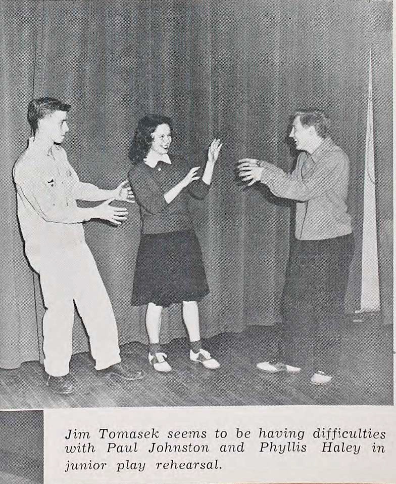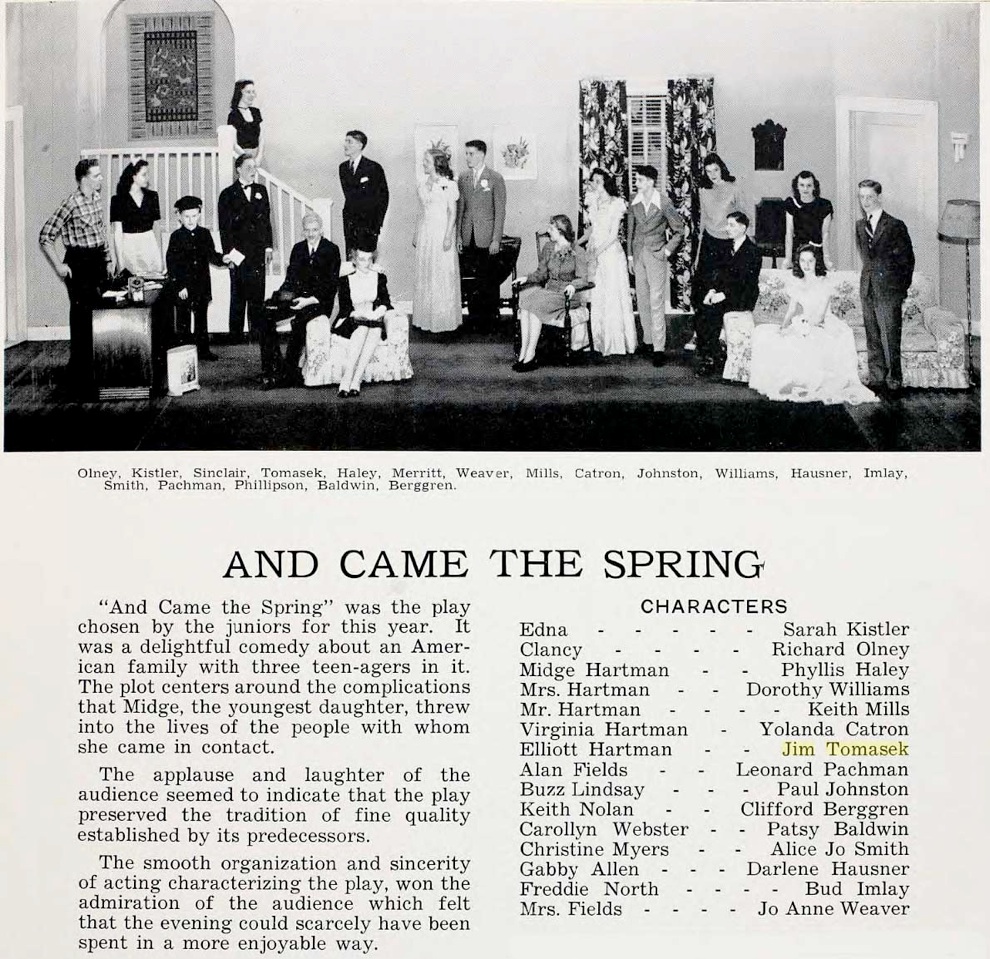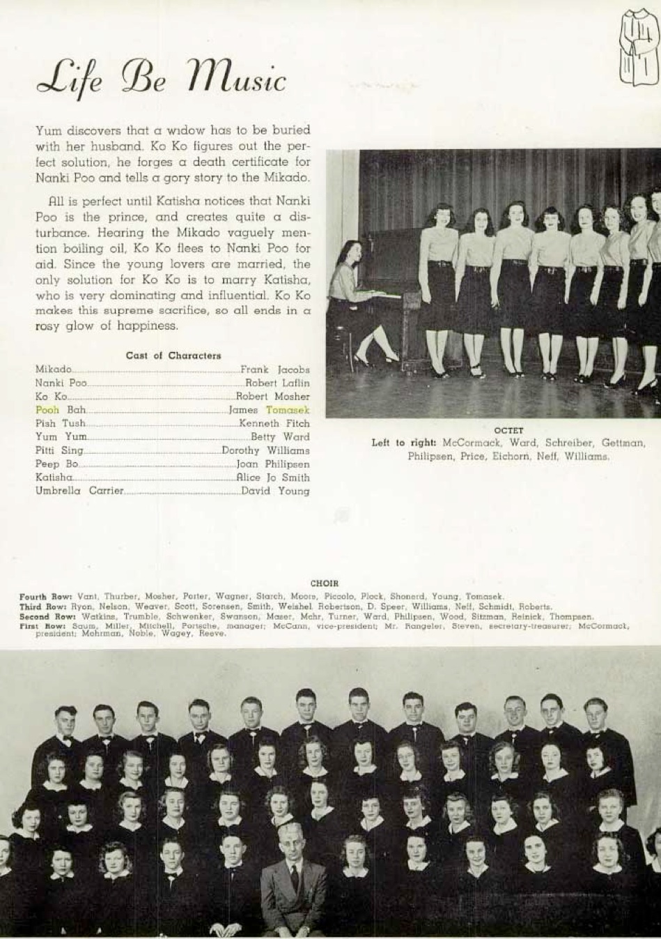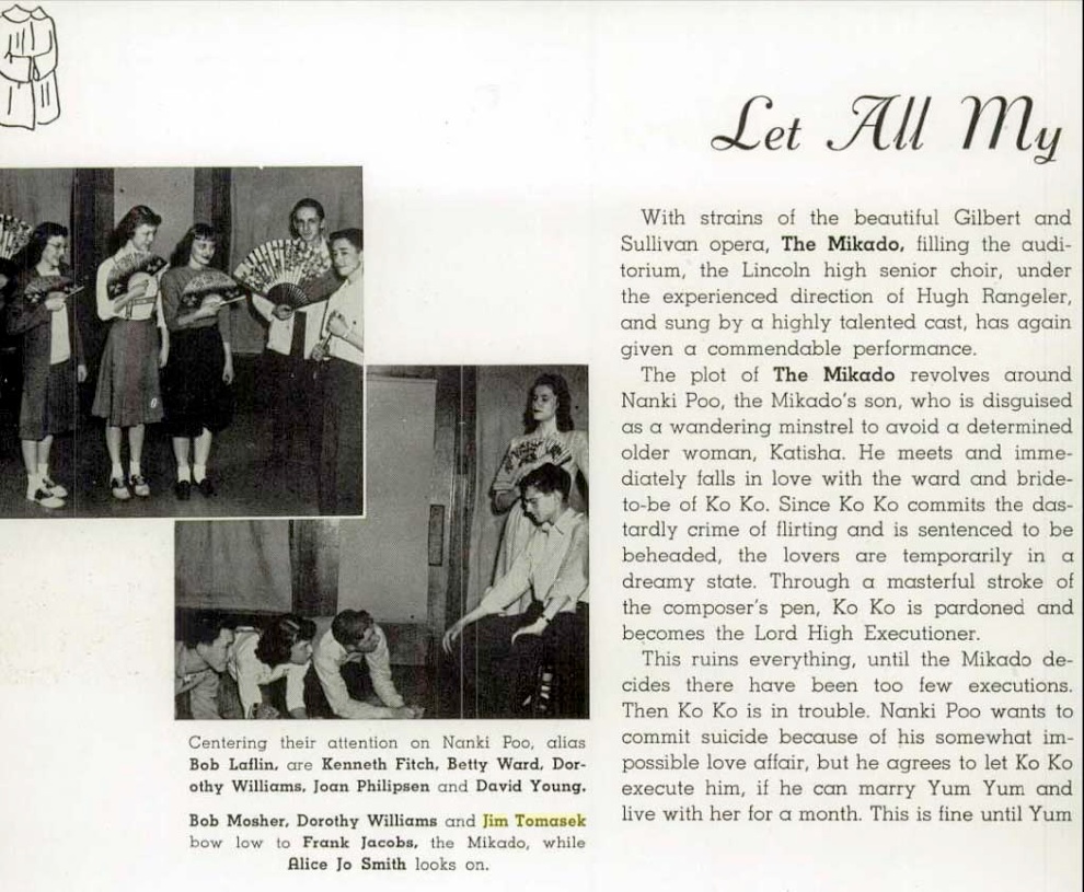 Jim in Mikado, senior year at Lincoln High School, 1947. Back row, far right. in 1947, Jim read the Gettysburg Adress before the Nebraska Legislature on Abraham Lincoln‘s birthday.