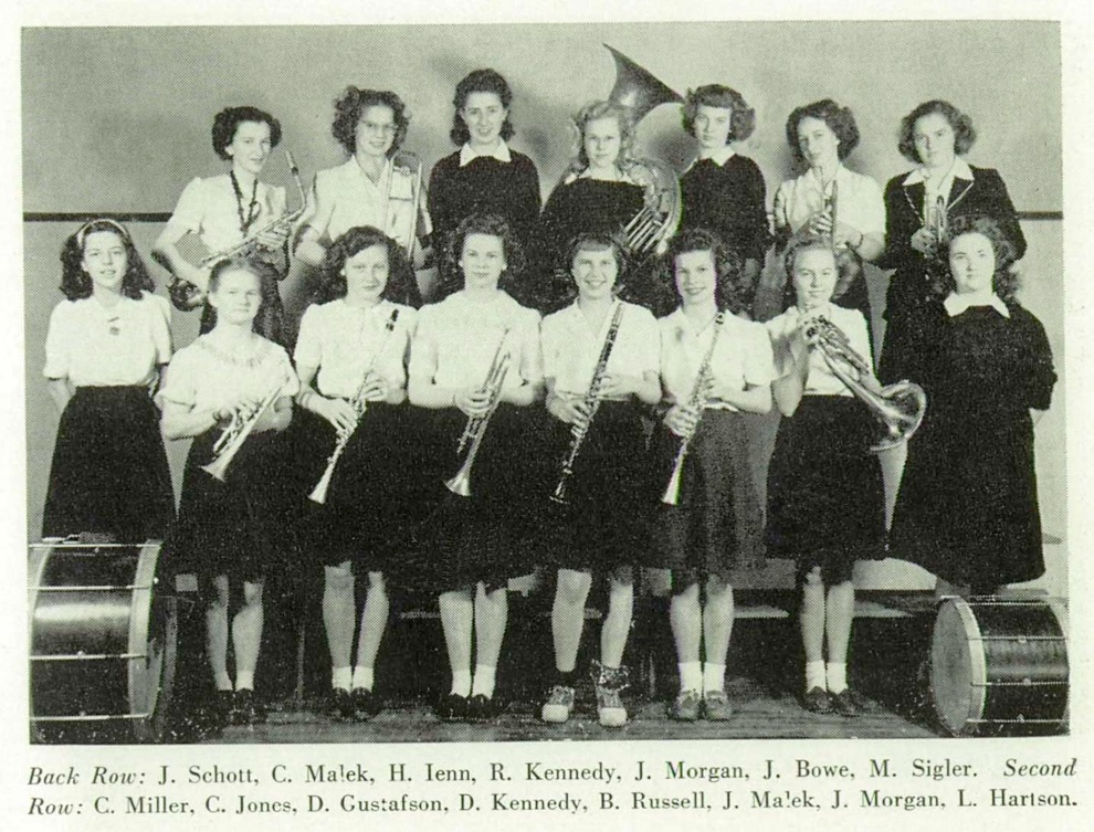 Mary Sigler, Osceola High School Band. 1947. Mary back row, at right end.