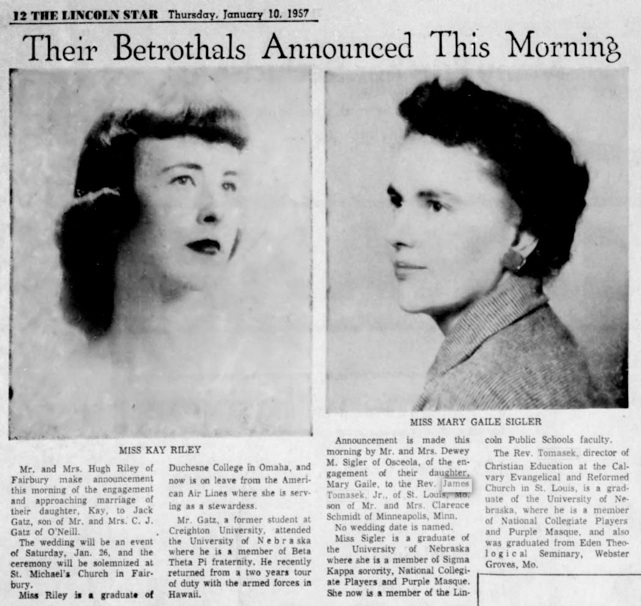 Mary Gaile Sigler was born in Osceola, Nebraska to Dewey and Mildred Sigler. Jim likely met Mary as a result of their shared dram interest. Mary was very active in drama at Osceola High School. She continued that interest at the University of Nebraska at Lincoln. She won many honors while there and like Jim was inducted into the Nebraska Masquers Chapter of the National Collegiate Players. Following graduation in 1951, she taught at Lincoln High School in Lincoln. She was in the English department and was technical director of plays during this time. She and Jim came engaged January of 1957. They married later that year on August 18.