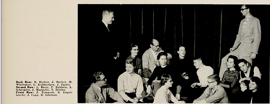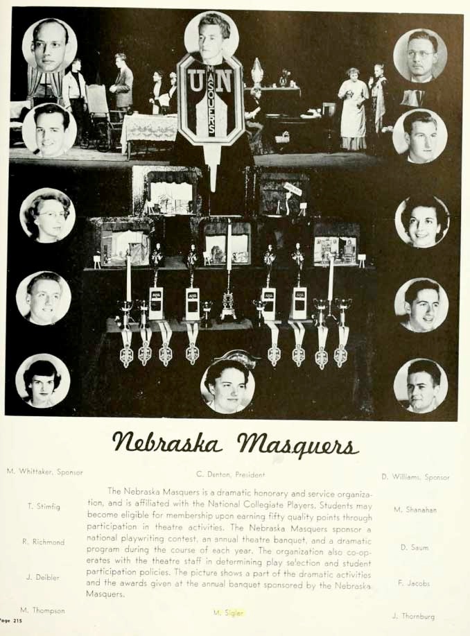 Outstanding students in theater activities were rewarded with a membership in the Nebraska Masquers Chapter of the National Collegiate Players. Jim was one of those students in 1950. He is sitting at far left.