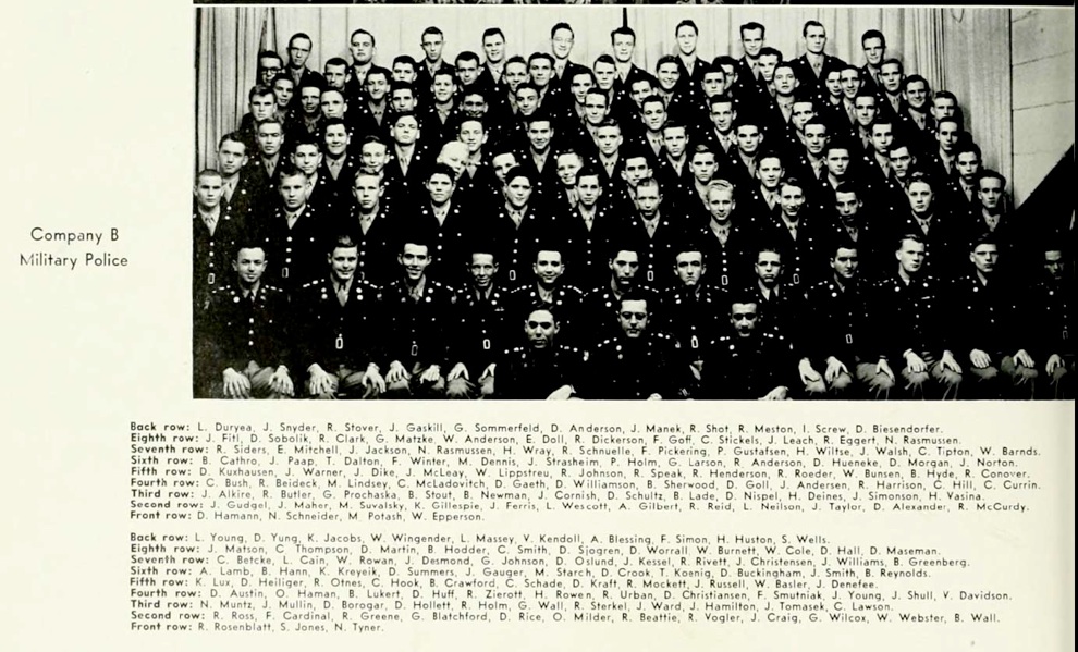Here is Jim in the Military Police at University of Nebraska at Lincoln. He is in second row, second from right end. He does not appear happy, 1950.
