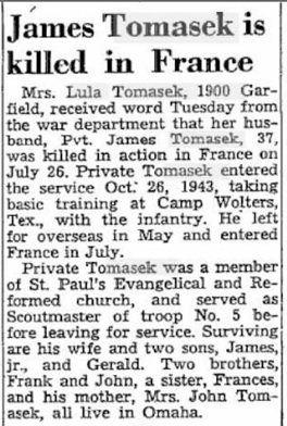 On July 10th, 1944, VII Corps was on the offensive with the 4th, 9th and 83rd Infantry Divisions abreast. Crossing the Canal de Vire, the 9th Division moved on the Hommet Woods. Slowly but surely pushing on, it moved until it reached the St. Lo – Perriers Road by July 21st. A lot of action took place on the 25th of July, 1944. On this day all troops of the 47th Infantry Regiment were pulled back about 1200 yards north of the Periers – St. Lo road. They assembled in an area west of Ponte Ducrie, near the hamlets of La Cuillourie and Ponte Hairie. 1st Battalion held the area at the west, 2nd Battalion was in the middle, and the 1st Battalion on the east. Allied bombing started by medium bombers and the first raid went OK. However, by the time that the heavy bombers arrived, the south wind had blown the smoke designating the bomb line back onto the troops. As a result, the heavy bombers bombed their own men. Men of the 1st Battalion only suffered a few casualties. They were lucky, as one of the bombs dropped right in the middle of an aid station, but it proved to be a dud, and did not explode. 2nd Battalion also escaped with slight losses. The 3rd Battalion however suffered heavily. The Command Group of 30 men were all killed or wounded except for the Battalion commander and the Commander of K Company. Several other members of K Company and one platoon of M Company also suffered losses during the bombing. This all happened in the morning, around 0930 hours. Around 1100 hours, 2nd Battalion began to push forward and attacked an area near La Couperie. 1st Battalion fought near Al Rillerie and went towards Marigny and the Periers – St Lo Road. 3rd Battalion took a bit longer to prepare, and fought their way via Montreuil. It sure was a though day for the 9th Infantry Division. On July 26, Jim’s father was killed in action. The notice that appeared in the “The Nebraska State Journal”, Lincoln, Nebraska, August 16, 1944, is at right.