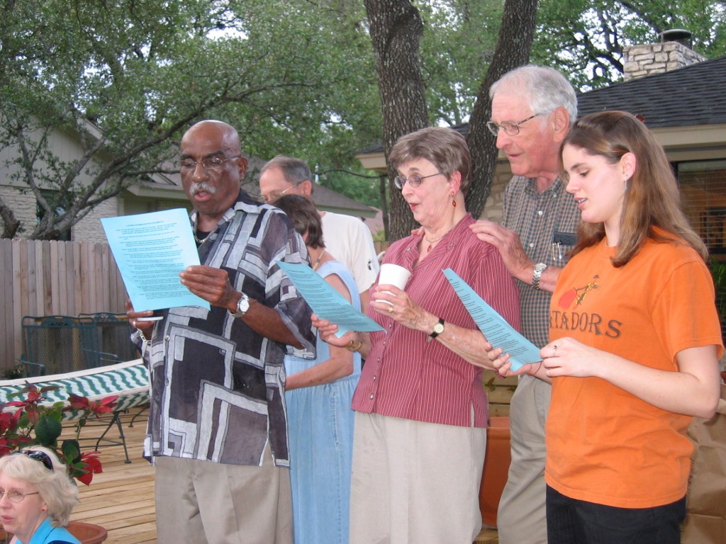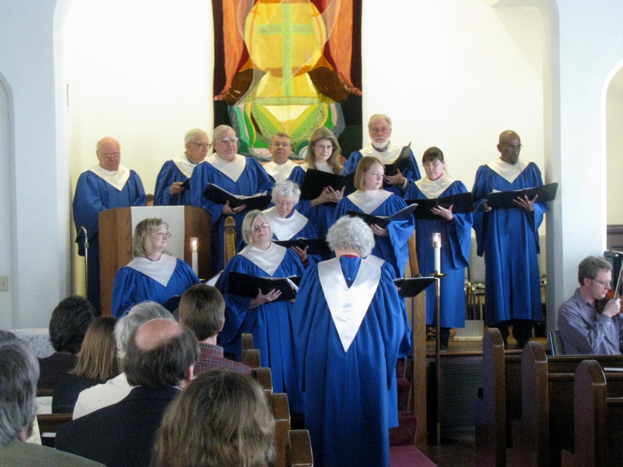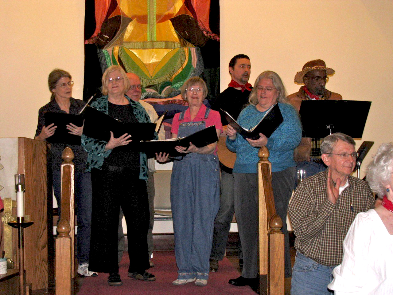 2/13/11 The choir singing a commissioned anthem written to honor Matt Blackstock. The choir --back-l-r Chester Rosson, Bill Mueller, Don Miles, Dennis Murphy, Norma Hawes, Rambie Briggs, Sara Ross, Joe McMillan; front--Becky Ellis, Betty Phillips, Cathy Hubbs, and Amy Harris, conducted by Nodie Murphy--Andy Strietelmeier with the violin |