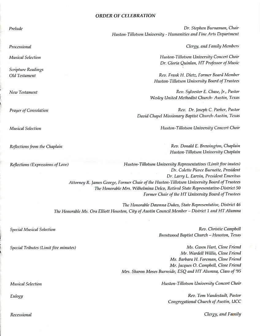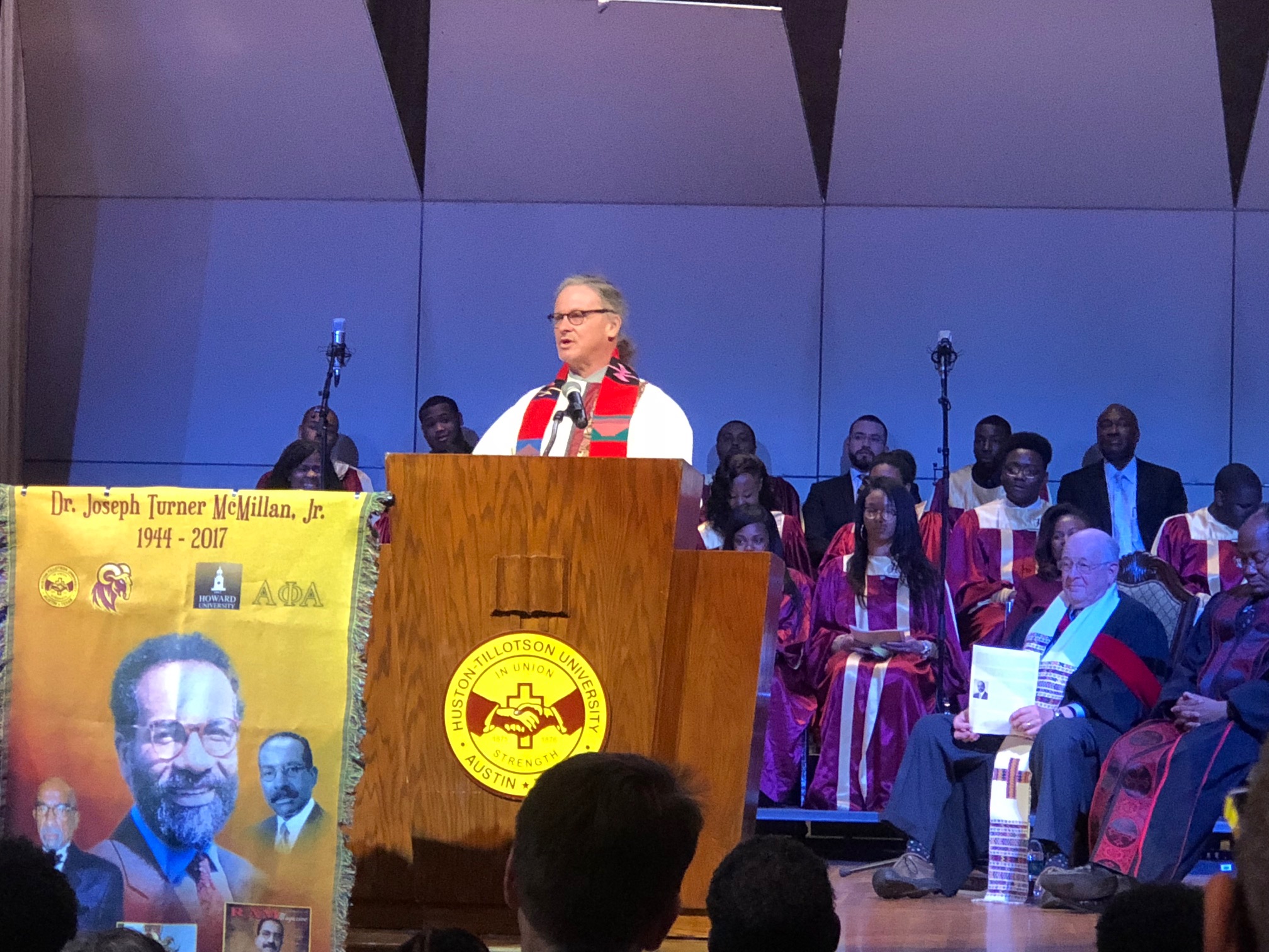 Rev. Tom Vandestad giving eulogy for Dr. Joe McMillan, Huston-Tilotson choir in background. Rev. Frank Dietz at right.