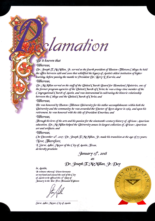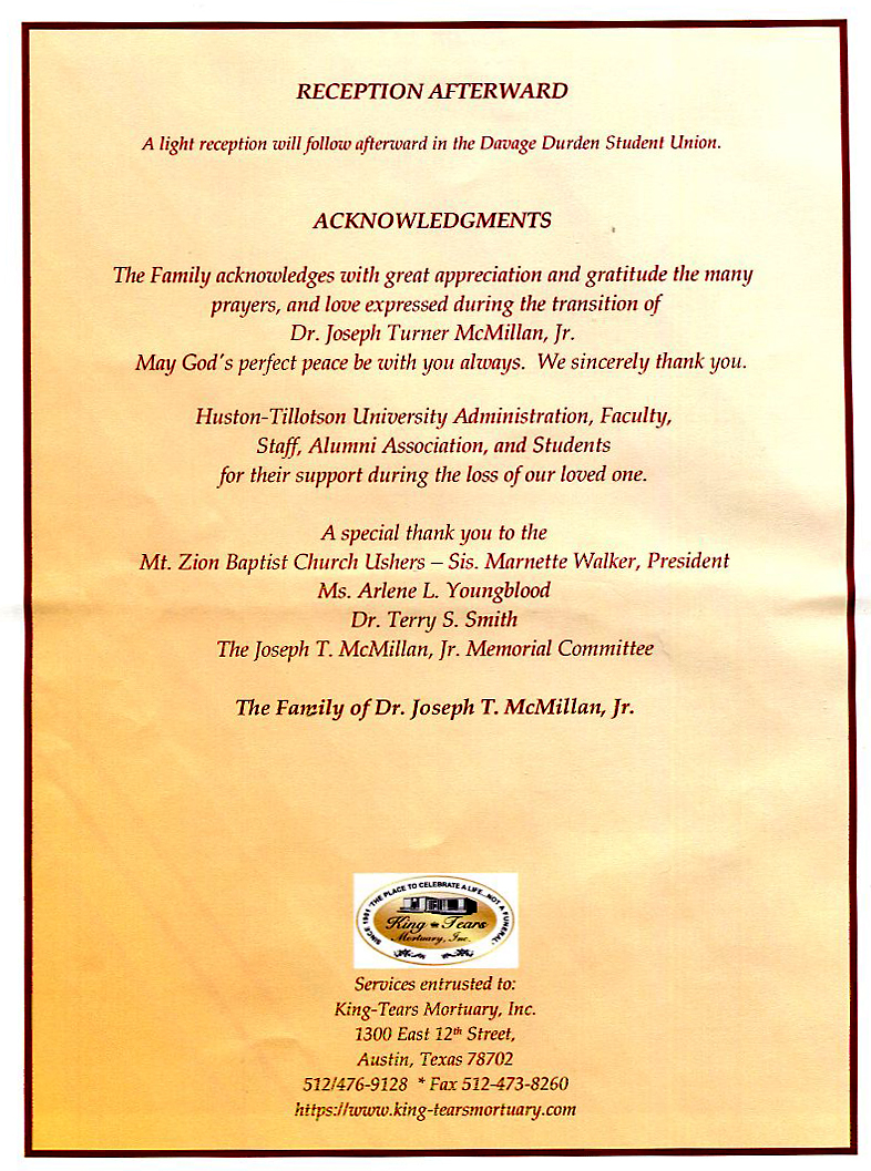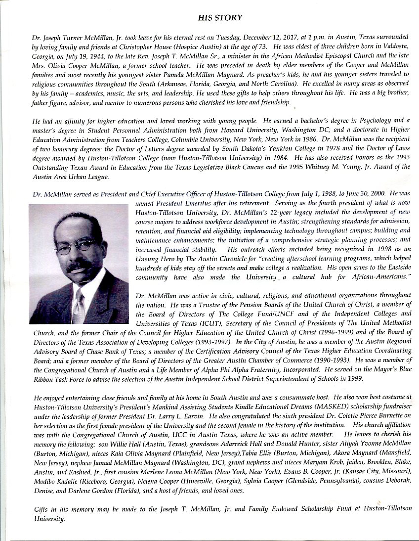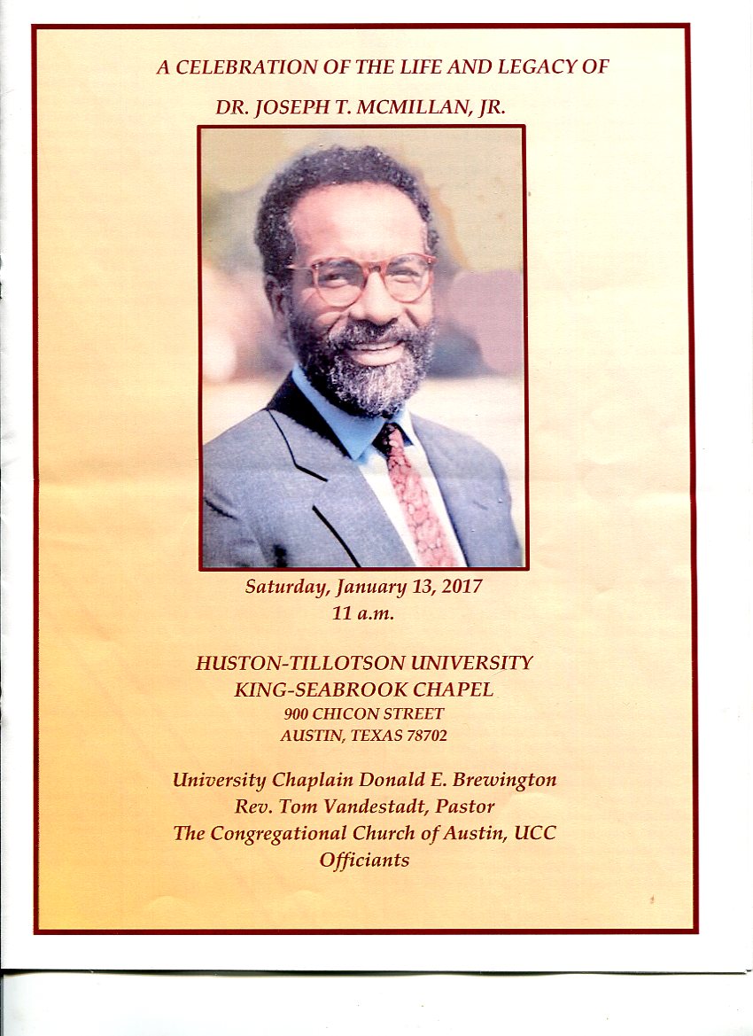 Donations may be made to the Joseph T. McMillan Jr. Scholarship Fund, Huston-Tillotson University, Institutional Advancement, 900 Chicon St., Austin, TX 78702.